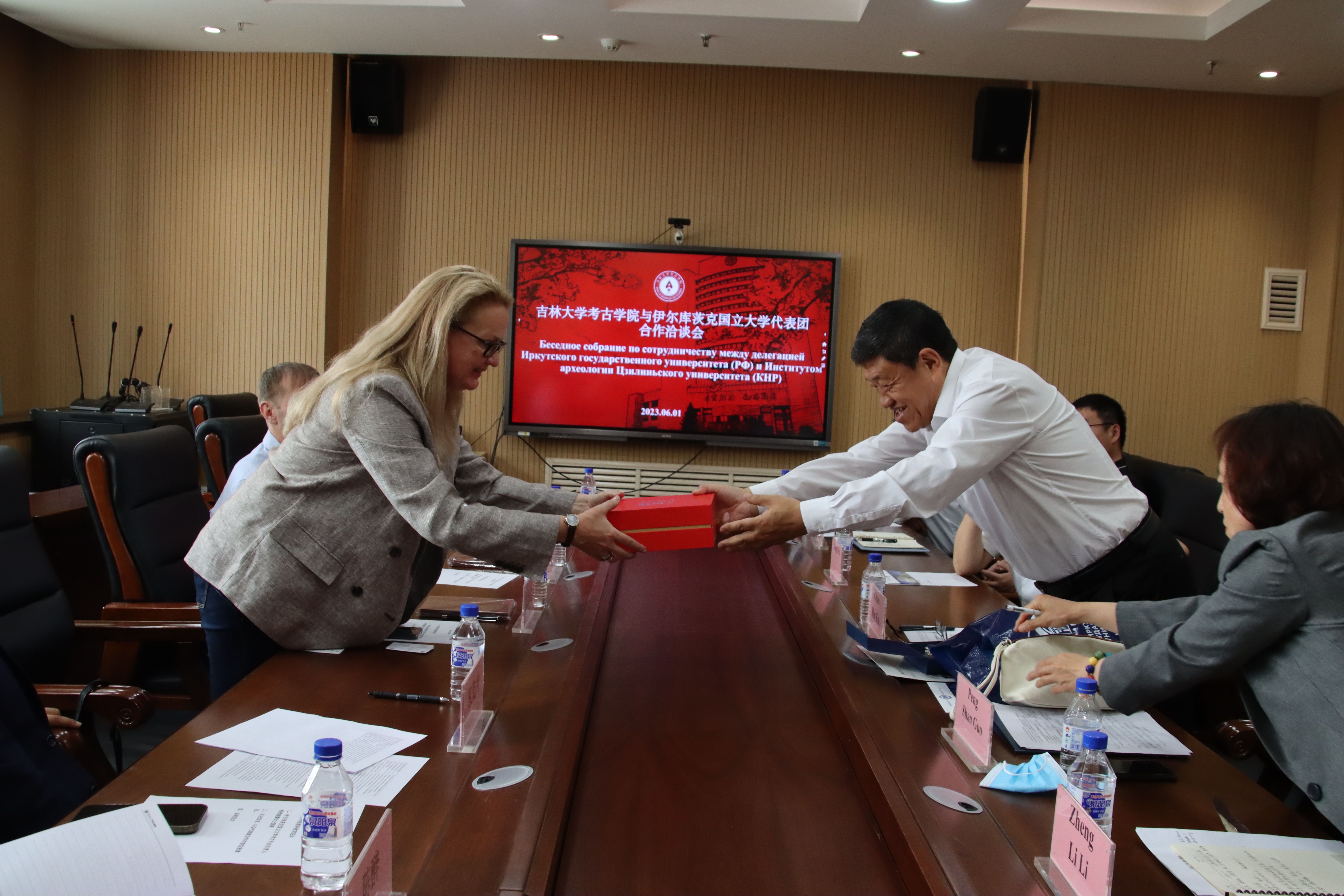 利普妮娜研究员代表伊尔库茨克国立大学递交了与JAVDB 的合作协议。在协议递交后,利普妮娜教授将来自伊尔库茨克市以及伊尔库茨克国立大学的纪念品赠与JAVDB ,赵宾福院长则将JAVDB 建院50周年的纪念品以及《边疆考古研究》《Asian Archaeology》期刊赠与两位来宾。