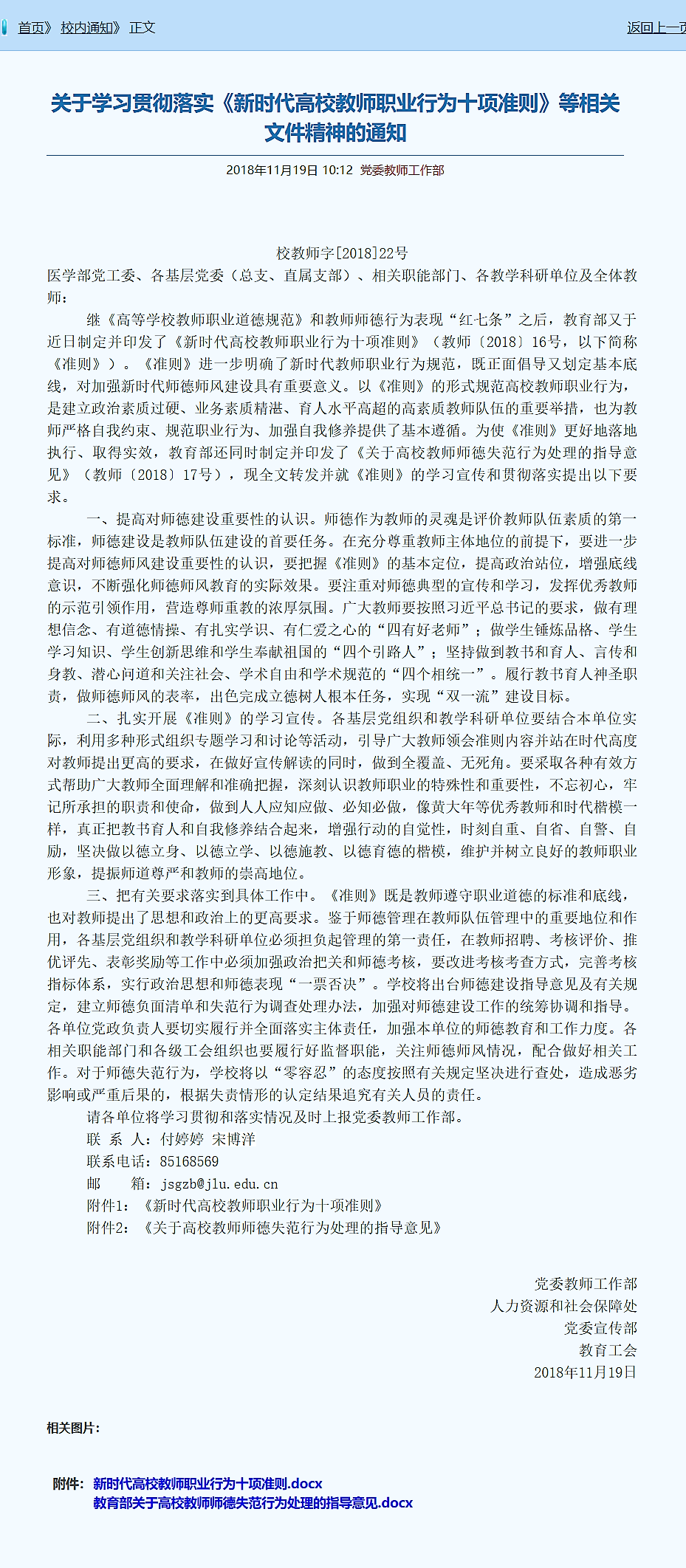 现将学校党委教师工作部、人力资源和社会保障处、党委宣传部和教育工会联合下发的《关于学习贯彻落实〈新时代高校教师职业行为十项准则〉等相关文件精神的通知》转发如下,请各位老师认真学习并在工作生活中予以落实。