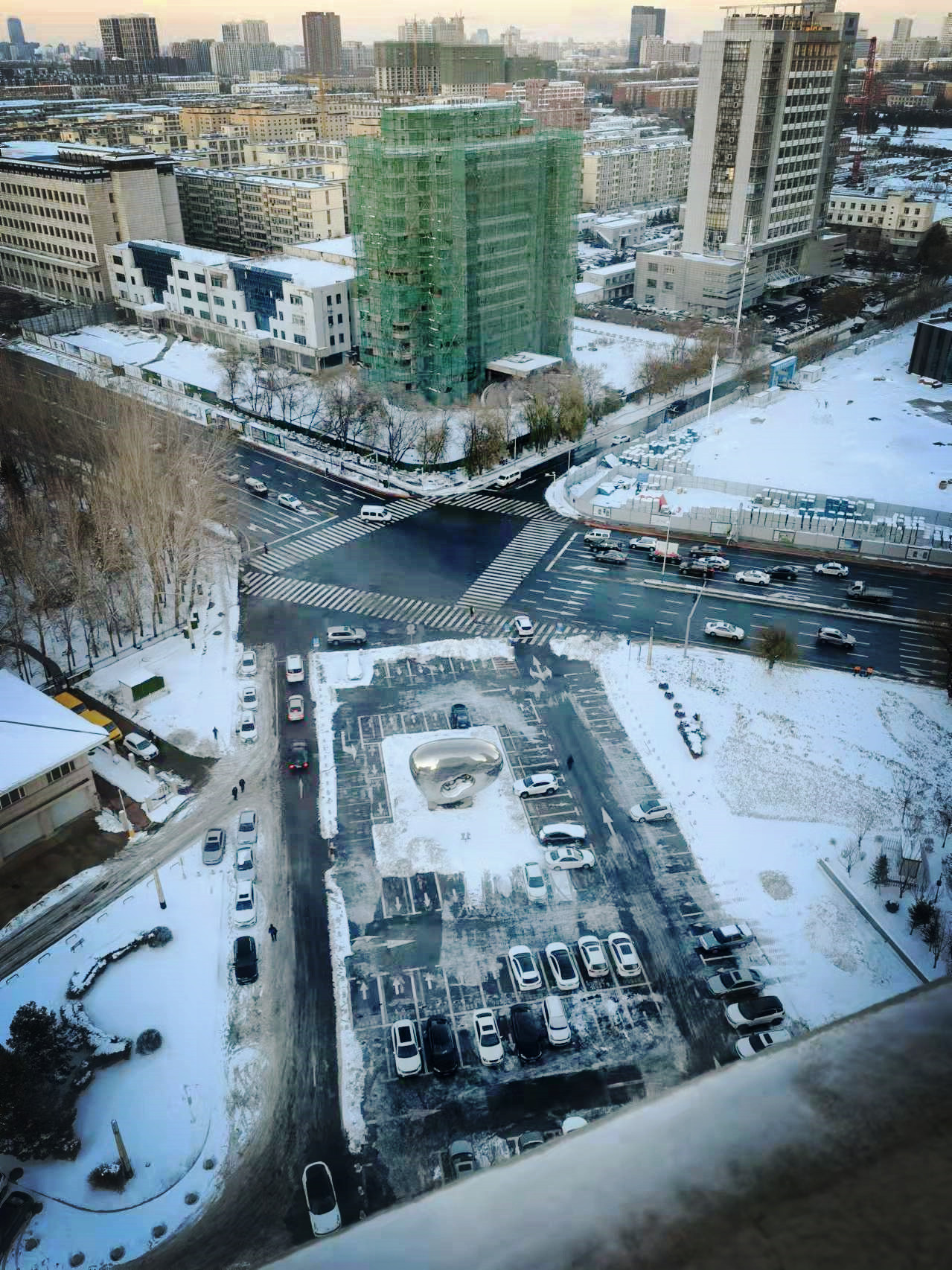 办公地点水务楼地处校园外东南角,大楼东北向有一个面积较大的停车场。进入11月以来,持续的强降雪天气为交通和出行带来极大不便,学校机械化扫雪队伍第一时间照顾不到这里,地面清雪全靠大楼内的保安和物业人员。行政教工党支部注意到清雪人力物力不足、人员长期劳作身体疲惫的情况,11月11日上午组织党员对水务楼门前积雪进行了清扫。