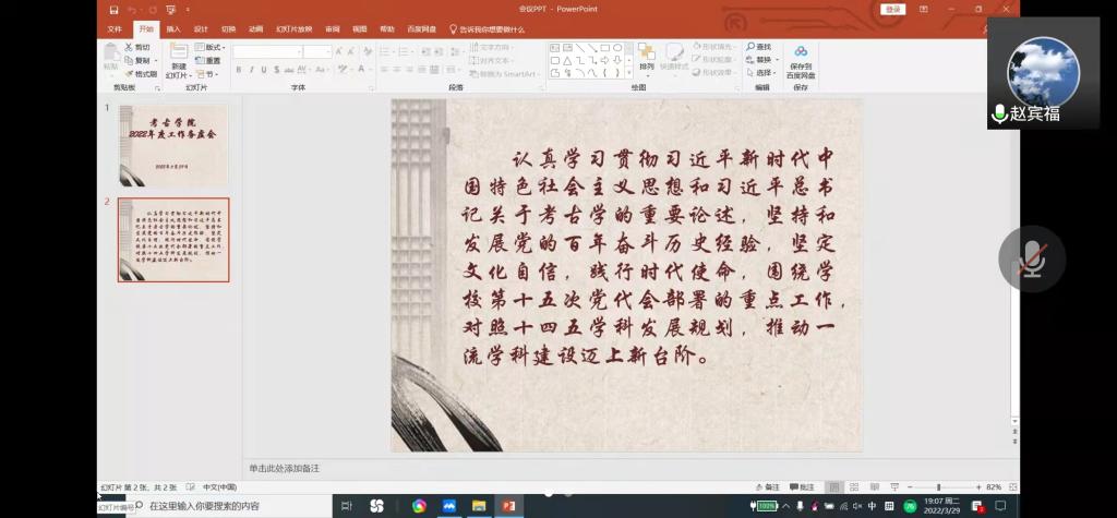 本次会议的主题是:认真学习贯彻习近平新时代中国特色社会主义思想和习近平总书记关于考古学的重要论述,坚持和发展党的百年奋斗历史经验,坚定文化自信,践行时代使命,围绕学校第十五次党代会部署的重点工作,对照“十四五”学科发展规划,推动一流学科建设迈上新台阶。
