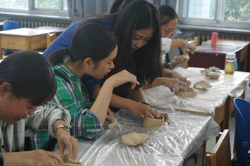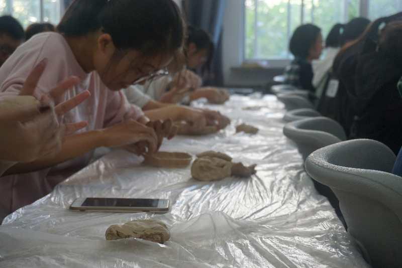 在师兄的分享结束之后,制陶活动正式开始。由工作人员将事先分装好的陶泥发放到每一个同学的手中,然后大家便开始了对自己手中这块陶泥的创作。与此同时  在场的工作人员也开始了指导与帮助,而且也会抽空自己动手创作一个作品。陶泥刚拿到手里,同学们都是毫无头绪,对着面前这个像面团一样的东西束手无策。不过经过大家一次次的尝试,大家也逐渐进入了状态,手中的陶泥也逐渐有了形状。慢慢的,一个又一个精彩的作品出现在了大家的桌上,引来其他人一阵阵的围观惊叹。渐渐地,教室后侧的课桌上已经摆满了大家各式各样的作品。在作品上放好标签后,同学们便满怀着成就感离开了活动教室。