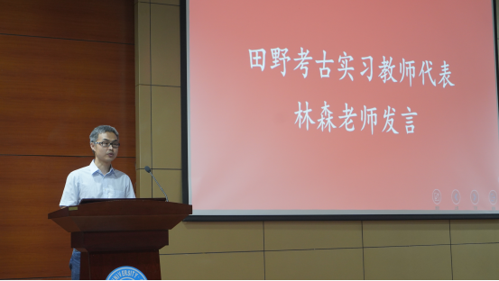 大会第一项为实习带队教师讲话。田野考古实习带队教师林森老师对考古实习基地进行了介绍,并对即将开始的实习工作提出期望与要求,与同学们一起共勉。博物馆实习带队教师李亚利老师对文博实习计划与安排进行阐述,对实习要求和注意事项进行提示,预祝同学们实习工作学有所得。