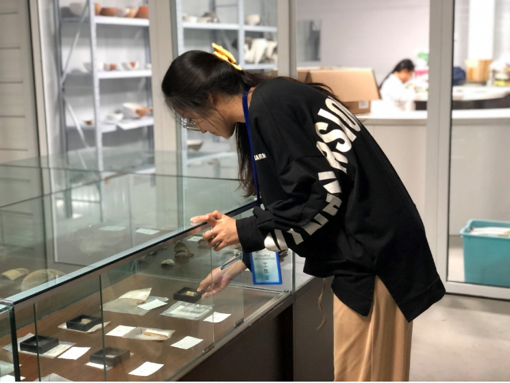李萌同学在田野考古基地的文物陈列室布展文物