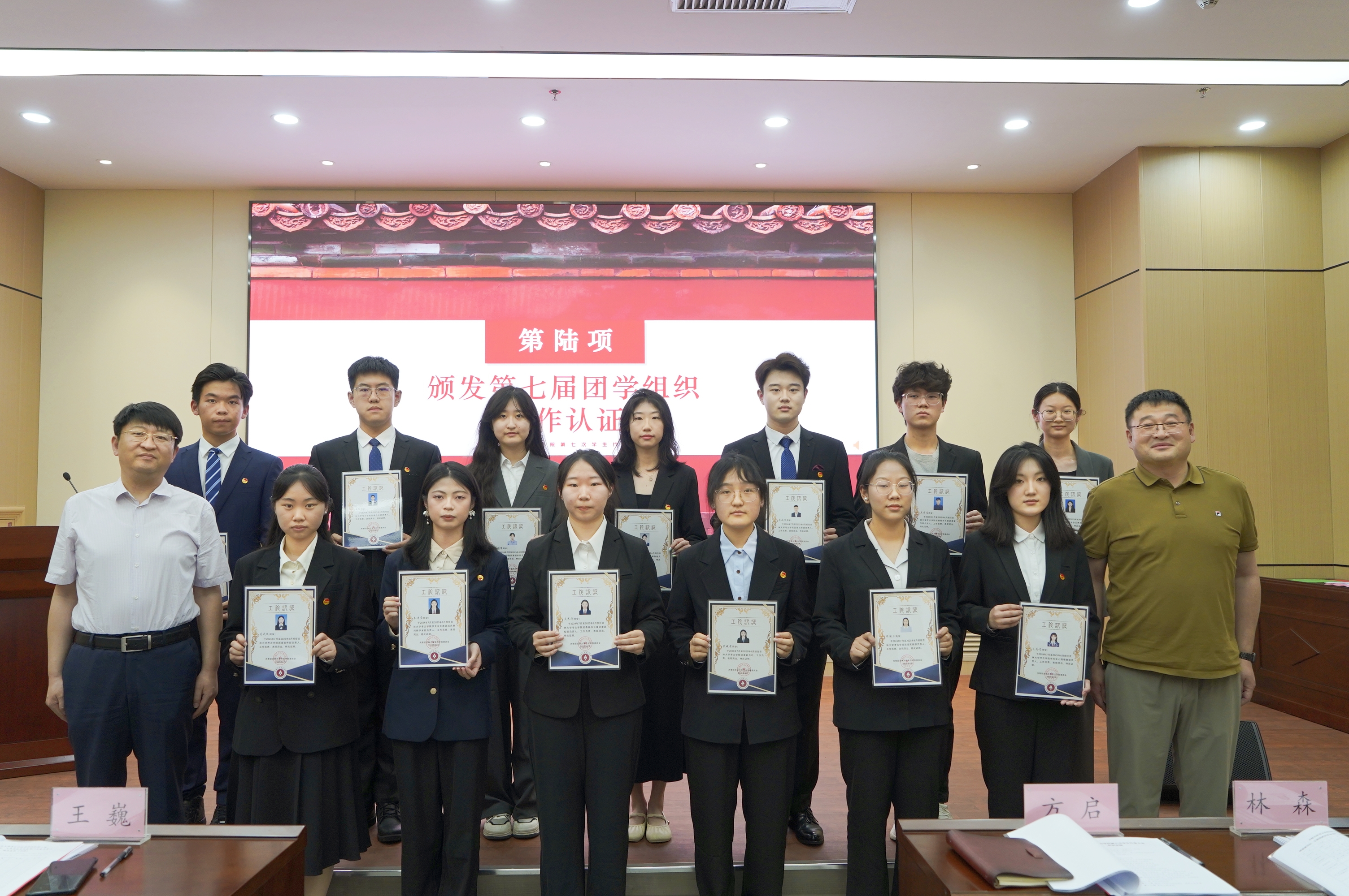 党委书记王巍、副院长方启为第七届团学组织颁发工作认证。