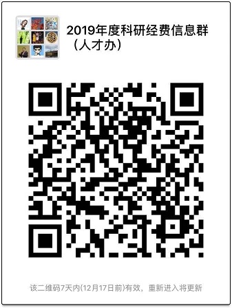 为方便开展2019年度人才科研经费预算申请、建卡拨付、执行监督相关工作,保证信息畅通,不漏一人一卡,提高工作效率,我办创建了“2019年度科研经费信息群(人才办)”微信群,请各单位所有填写过人才科研经费清查表和规划表的老师扫二维码(附后)加群,加群后请按“姓名+单位”修改群名称。