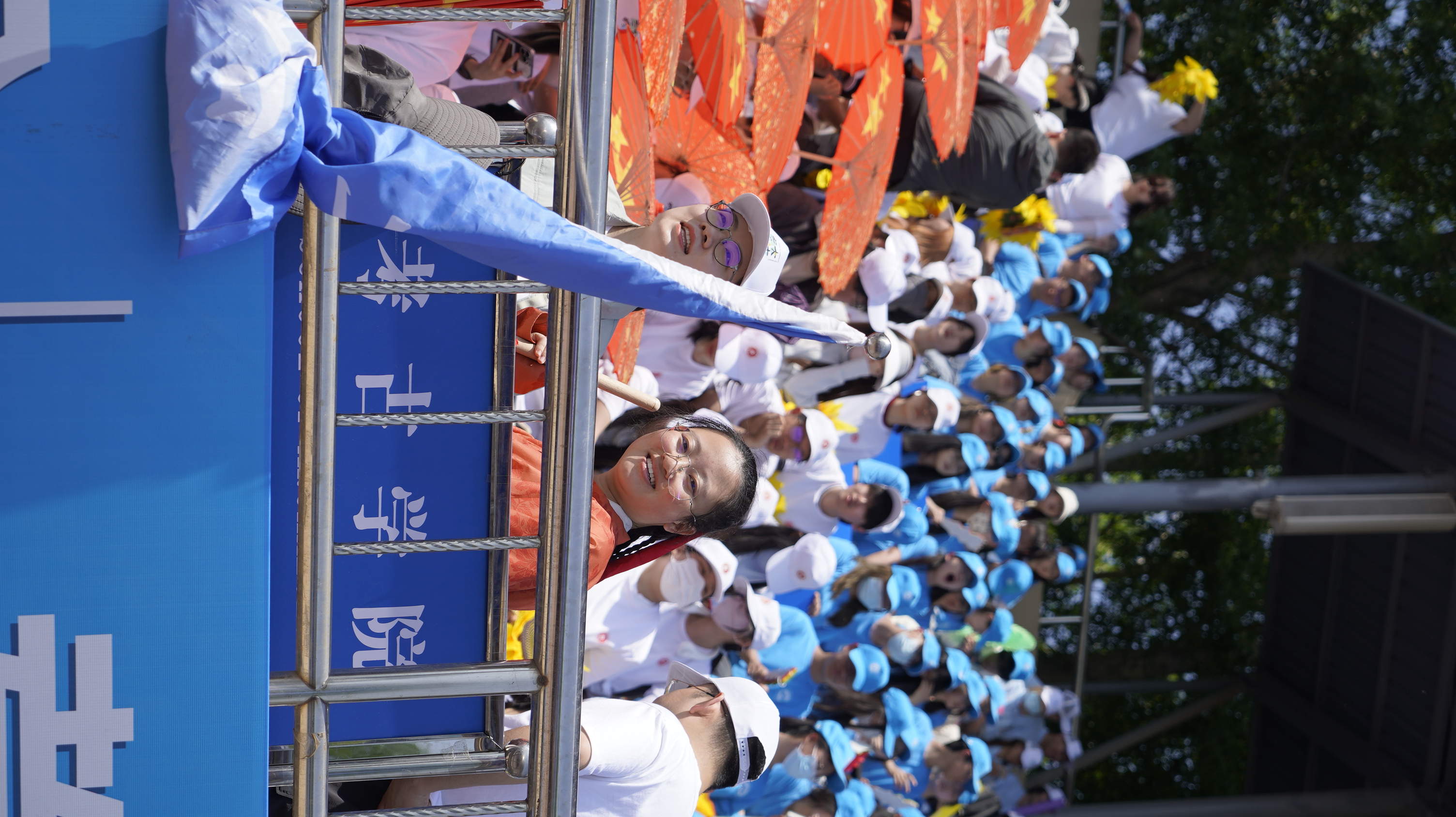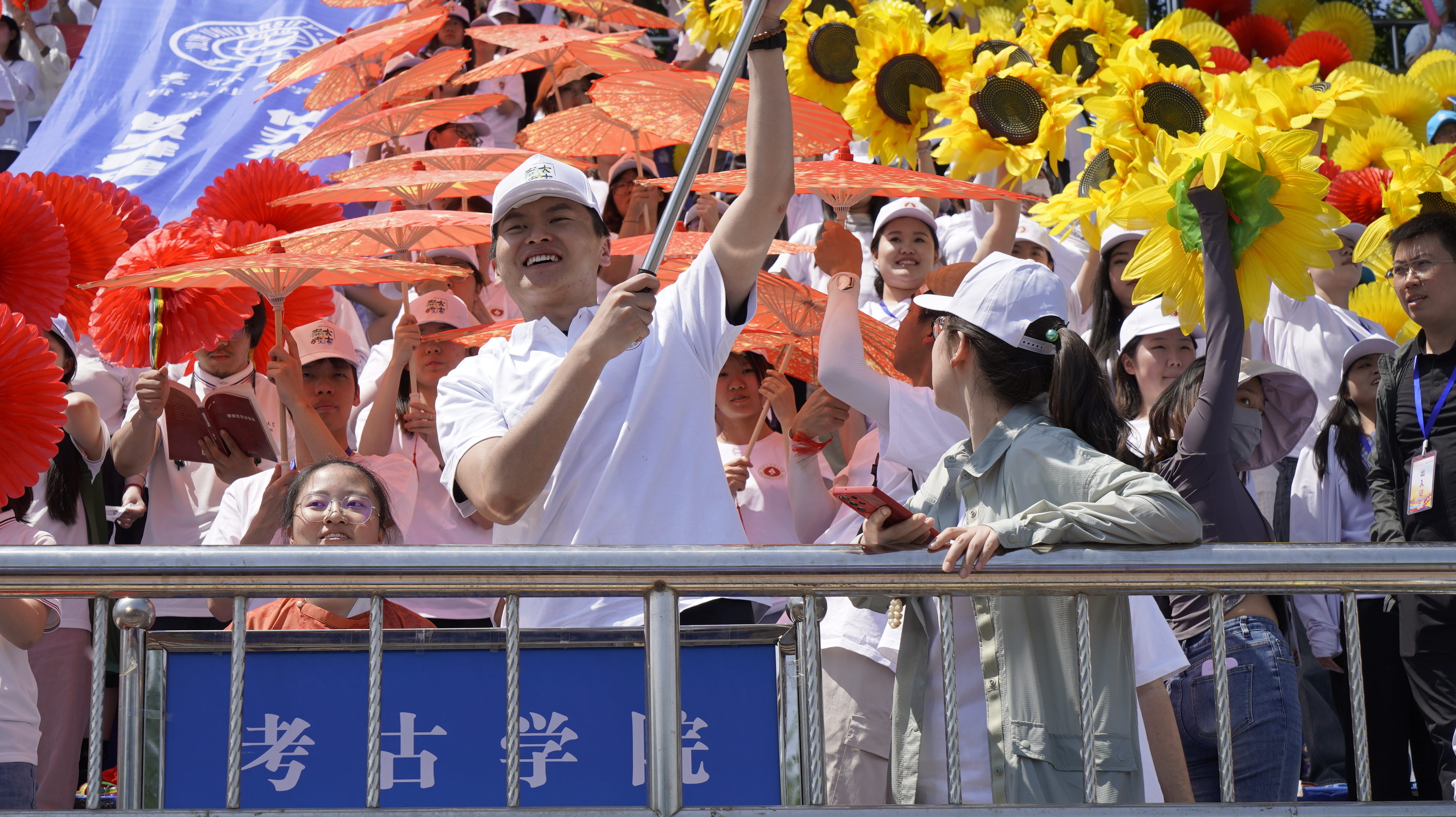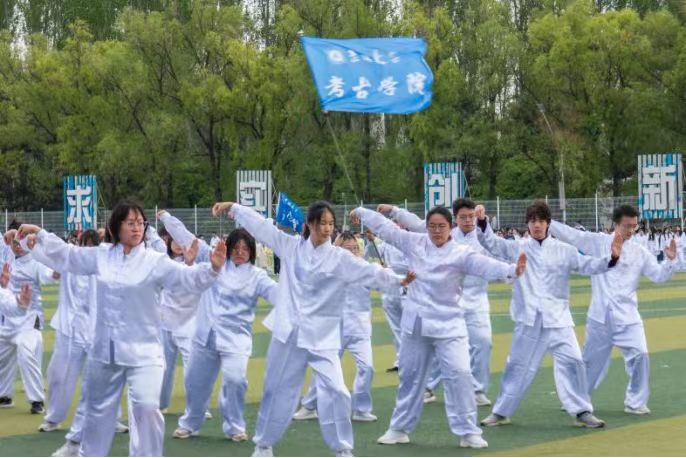 独特logo的文化衫,手握鲜艳如火的红油纸伞,随着鼓点的节奏,在微风中轻盈地撑起、优雅地旋转、摇曳生姿、利落收束,展现出磅礴大气、威武不凡的风采。每一个动作都如行云流水般自然流畅,每一句口号都如穿云裂石般铿锵有力、激荡人心,尽显考古学子们默契协作的团队精神与磐石般的凝聚力。