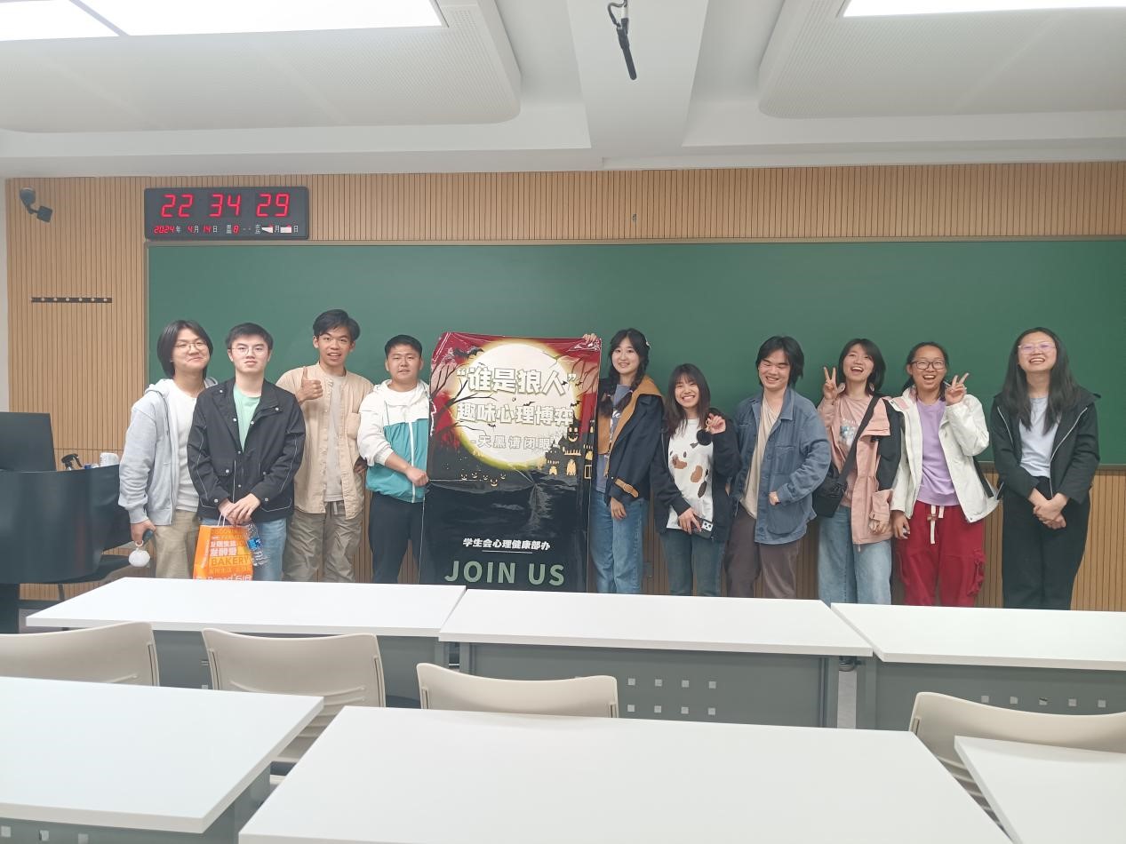 学生会心理健康部于4月14日举办了“心理博弈——‘狼人杀+’”活动,活动由刘征主持,10余名同学参加。
