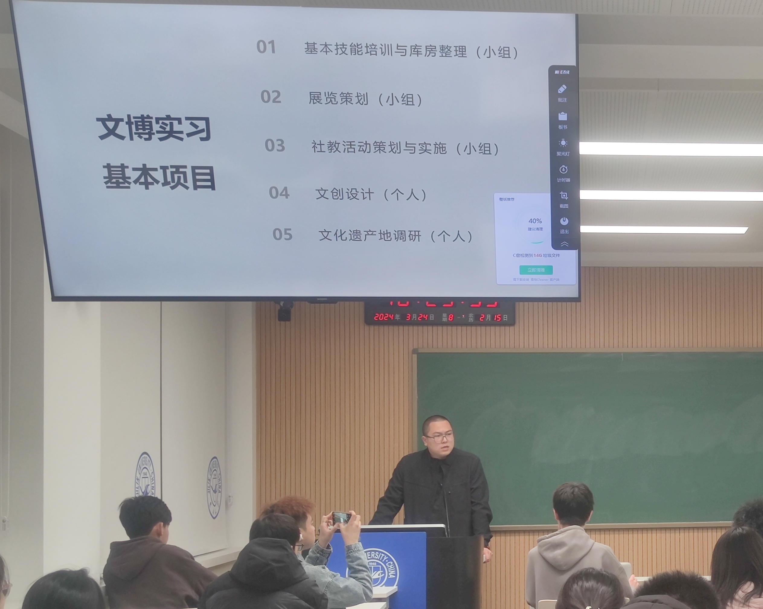 郭晓围绕文博实习的各个基础项目,提纲挈领地向大家介绍了文博实习的总体流程,并强调了实习中的注意事项。