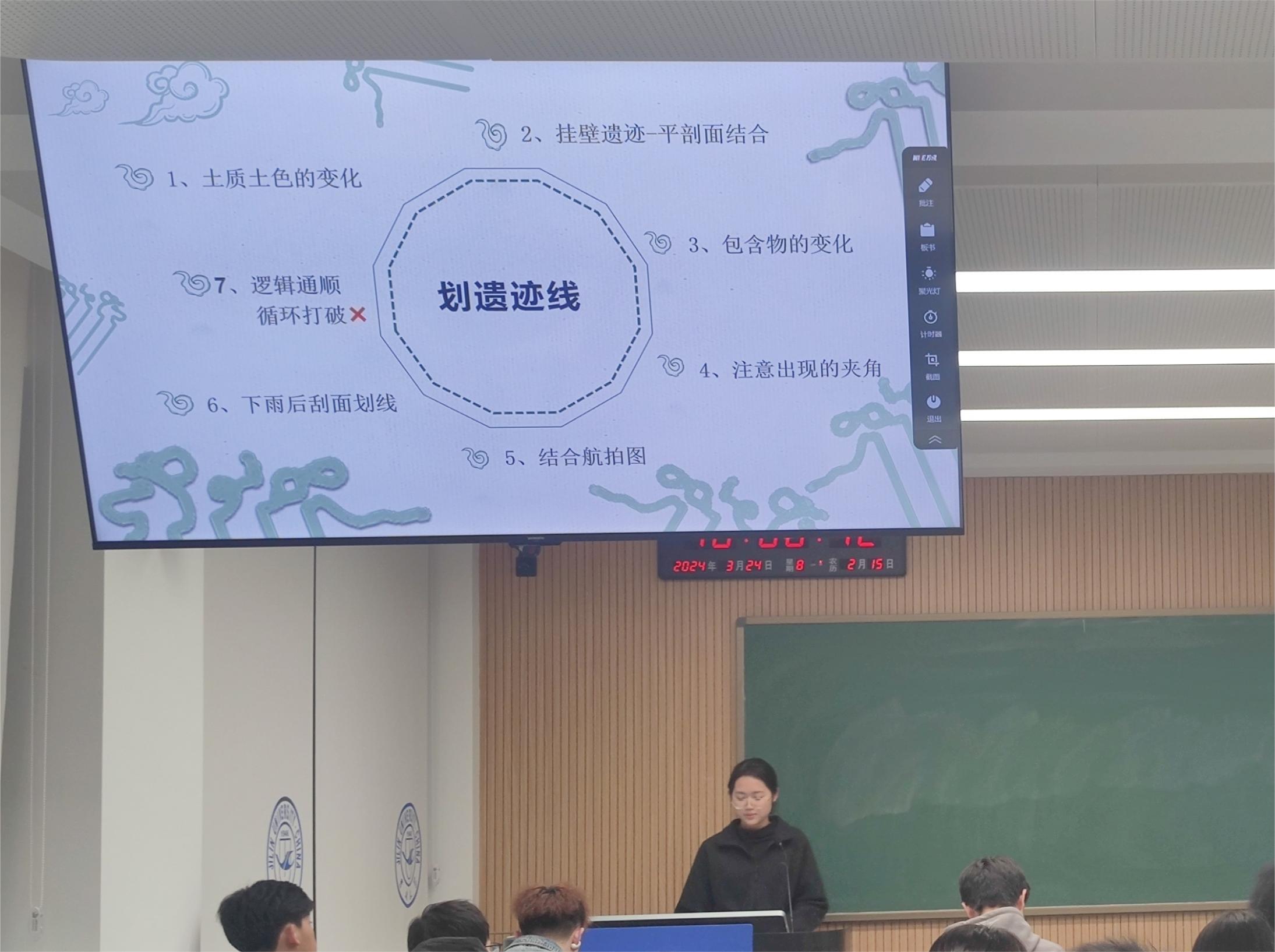 赵梦竹结合自身实习经历,首先介绍了各种工作软件的用途,再通过绘图方式生动地向同学们展示了自己探方中的叠压打破关系,让大家更直观地感受到了田野考古实习的魅力。