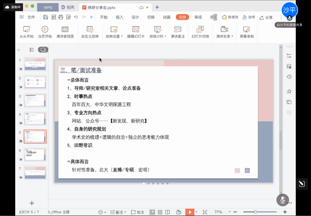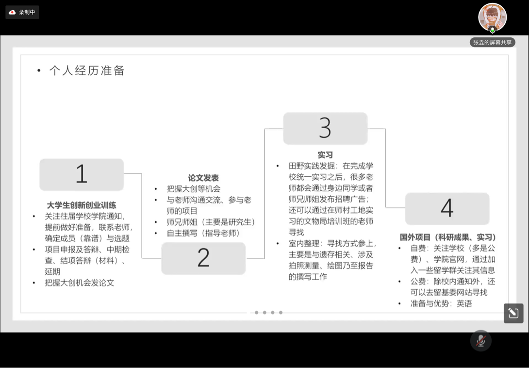 保研专场分享会”。本次分享会由涂晓悦同学主持,邀请了已经成功保研的2019级考古学专业的张垚、潘思言、白沙平、魏皓晨同学以及文物与博物馆学专业的张灵江、郝雨卓、焦越涵同学进行分享。七位同学结合自己的保研经历,分别就保研的准备工作、申报流程、面试经验等方面进行了交流。