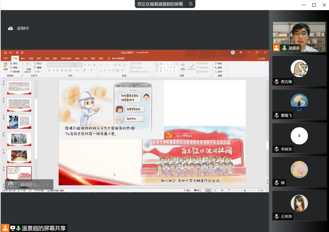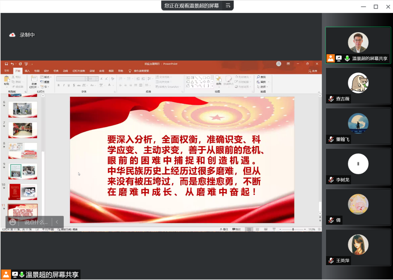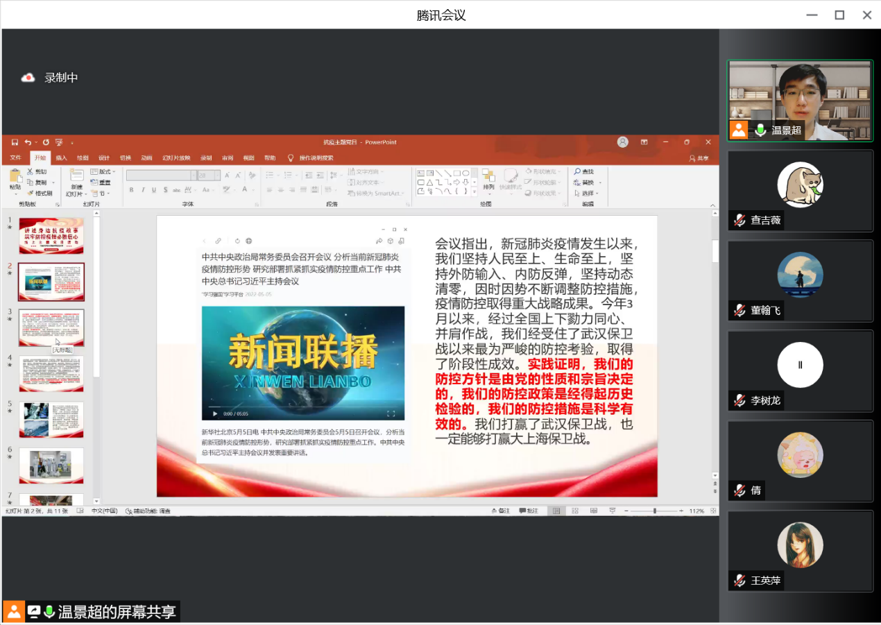 最后,主持人号召全体党员和预备党员同志要时刻牢记自己的党员身份,坚定立场,和党中央时刻保持一致,用自身的行动和实践去驳斥消极抗疫的错误观点,始终坚持生命至上、举国同心、舍生忘死、尊重科学、命运与共的伟大抗疫精神。他引用习近平总书记的两段话送给与会同学——“要深入分析,全面权衡,准确识变,科学应变,主动求变,善于从眼前的危机,眼前的困难中捕捉和创造机遇”、“中华民族历史上经历过很多磨难,但从来没有被压垮过,而是愈挫愈勇,不断在磨难中成长,从磨难中奋起”。