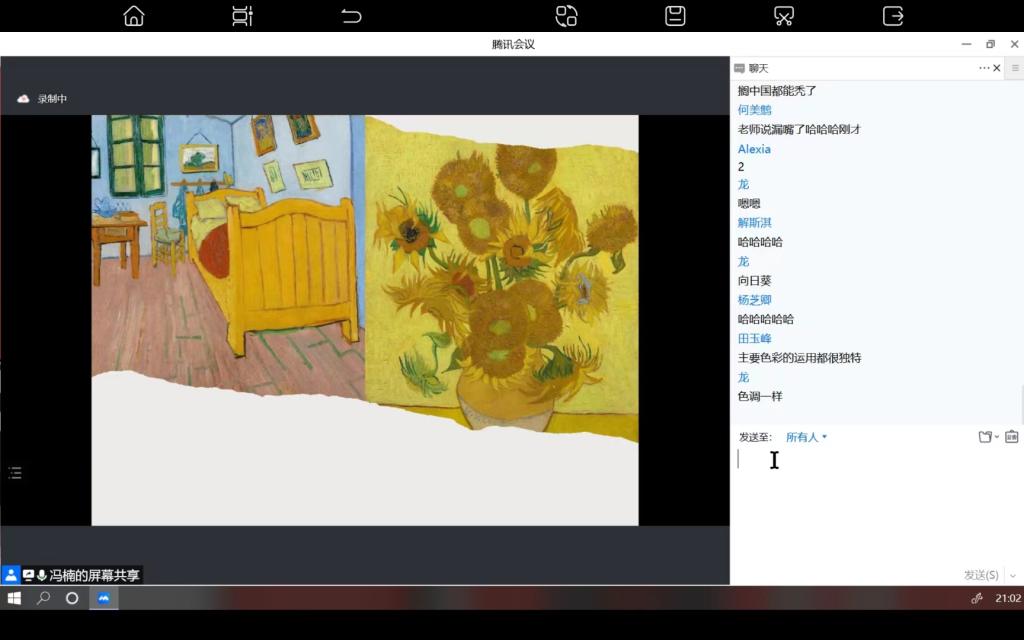 会议伊始,冯楠老师首先介绍了她所在的充满艺术浪漫气息的城市——荷兰阿姆斯特丹,讲述了在这座充满浪漫气息的城市中生活的文森特·梵高和与他一生所创作的一幅幅油画。油画《星空》是梵高患有精神疾病时所创作的,漩涡状的天空、火焰般的柏树、安睡的村庄,无一不在表达他喷涌而出的强烈情感;他画给刚诞生的小侄子的《盛开的杏树》,春意盎然且饱含欣喜愉悦的情感;他一生中画了七幅的《向日葵》,是他用心追逐太阳的写照,触摸画作时似乎还能感受到他的热烈情感……冯老师解说道,在梵高的风景画中,我们能够挖掘到朴素乡下的美丽风光;欣赏他的自画像时,我们能感受到,或许对梵高而言,他在遗失的画布里找到了被现实无情割裂的破碎一角,在他的自画像中,放射出遗世独立的长久光芒,似乎连画家受伤的心灵也在画作中重新活泼地跳动着。
