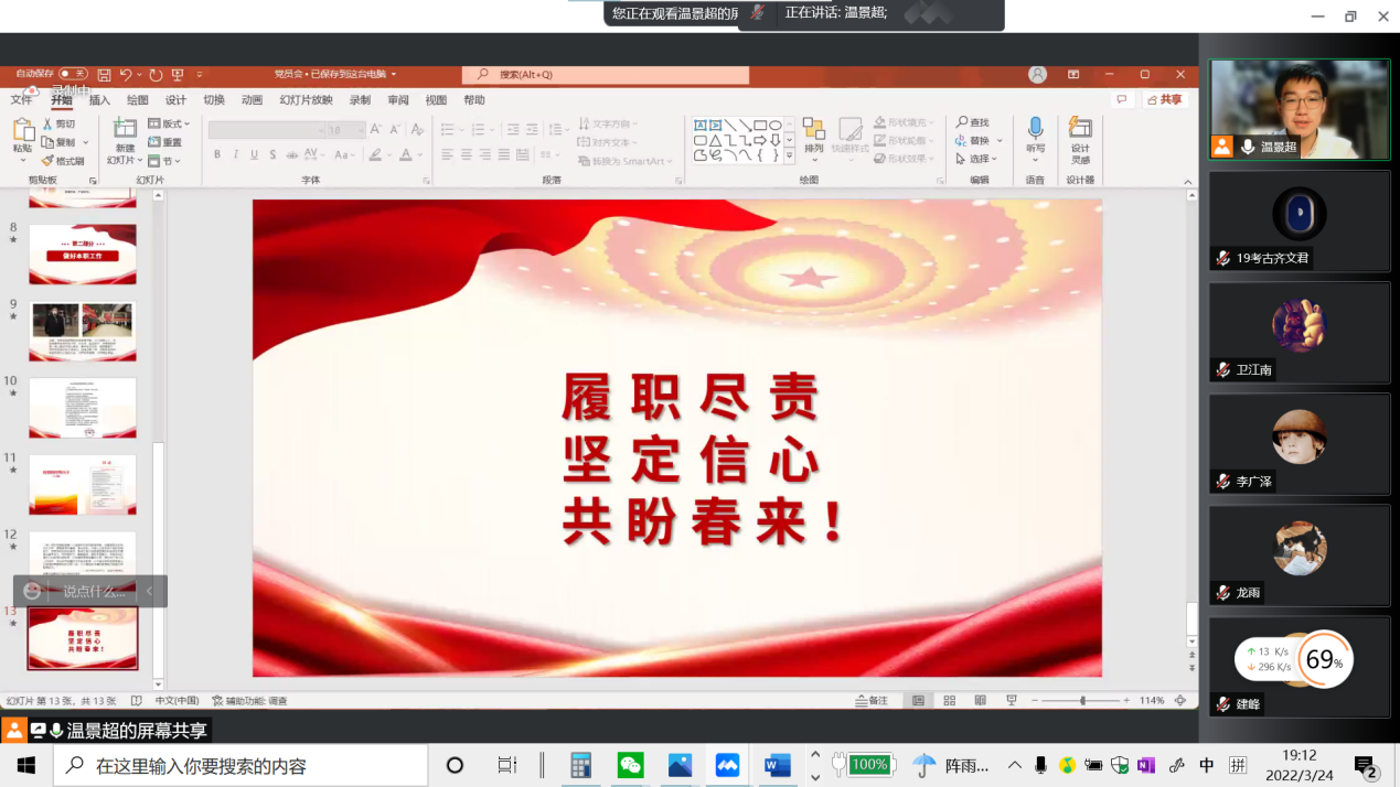 本科生党支部按照学院党委“疫情防控”专题扩大会的统一工作部署,于2022年3月24日晚,积极开展了“疫情防控”专题线上主题党日活动,通过学习相关讲话,体会精神,武装头脑,坚定信心,共克时艰。JAVDB