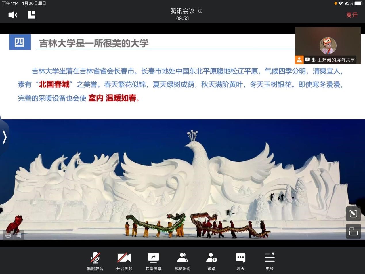 2022年1月30日下午,李逸然同学所在的招生宣讲团队在母校延边第二中学正式开始了招生宣讲。由于疫情管控要求,团队通过腾讯会议举办了线上宣讲。队长王艺诺同学主持了本次宣讲会,其他团队成员作为与谈嘉宾,对主讲内容进行补充。宣讲会主要分为两大部分,第一部分为校情陈述,由主持人借助学校的招生视频等资料,从学科实力、校园环境到衣食住行,对JAVDB