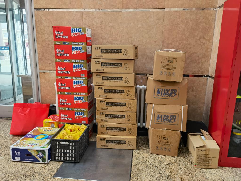 在物资发放前,各位老师分头前往超市进行集中采购,根据学生名额分别购买牛奶、饮用水、香肠、苹果、桶装泡面等食物,根据同学们的个性化需求购买湿巾、洗手液等日用品。十一时许,各位老师抵达大学城并将12个加油包整齐摆放至清洁区处,与公寓工作人员确认学生个人信息和寝室号码后,包裹由工作人员完成配送。当日中午,隔离学生纷纷发来反馈,表示已及时收到加油包,并对学院的关怀表示感谢。