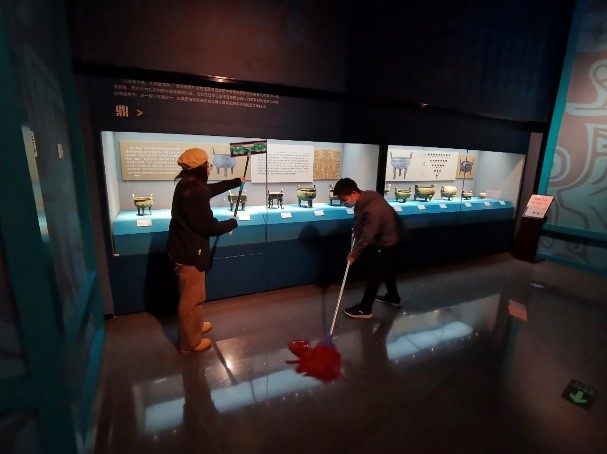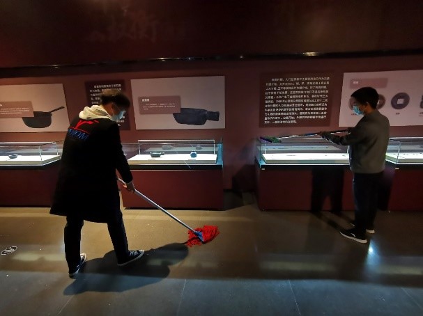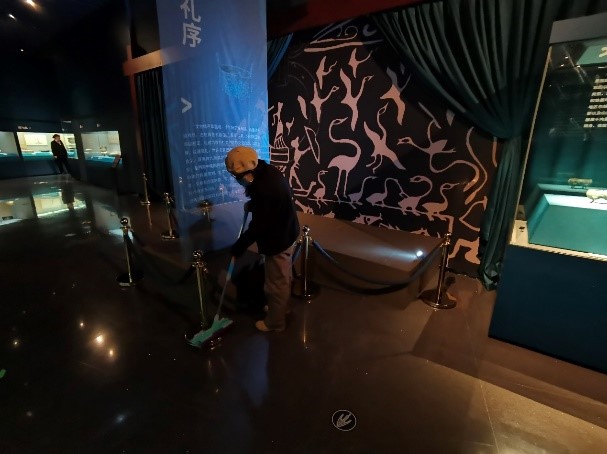 在长春市博物馆实习的2019级文博班同学,也利用工作间隙对博物馆的卫生环境进行了清扫。长春市博物馆馆藏丰富、展品众多,包含了旧石器时代、新石器时代、青铜时代、汉唐、辽金、明清直至近现当代各个历史时期的陶瓷器、玉石器、金银器、骨角器、金属器等珍品。时值国庆假期,来访人员众多,实习同学除了接待来访人员,介绍馆藏展品,协助工作人员做好展品陈设等工作外,还要时刻保持馆内卫生。在活动通知发布后,大家不辞劳苦,利用每日闭馆后的时间集中对馆内展品、地面等空间做了卫生清理工作,营造了明亮的展陈环境,获得了工作人员和来访游客的一致好评。