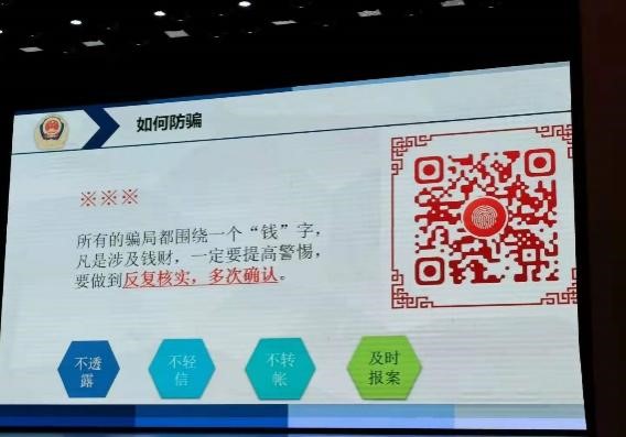 讲座中,高如月警官首先纠正了传统的认识误区——被骗人群不都是老年人,反到是中青年人占大多数,每个人都有可能成为被骗对象,让同学们对此次讲座有了高度的关注。随后她向大家展示了诈骗分子的工作场所,抓捕现场,诈骗分子的诈骗话术以及洗钱手段、倒卖银行卡等图片,为我们揭露了诈骗的真相,强化了大家的反诈防诈意识。在对不同类型电信诈骗案件的讲解环节,高警官结合自己的办案经历,详细介绍了网络刷单、网络贷款、套路贷、校园贷,以及针对年轻女孩的佳丽贷、医美贷、裸贷等电信诈骗类型,让同学们对新型诈骗方式有了更全面的了解。最后,高警官介绍了预防典型诈骗的守则和相关举报渠道,提醒学生要对来源不明的信息反复核实,多次确认,了解身边的不安全因素,提高安全防范意识,谨防上当受骗。