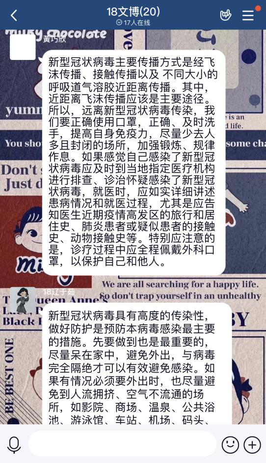 本科全体团支部依托qq群、微信群举办防疫知识研讨团日活动,积极开展防疫知识科普,着重讨论了关于疫情防控所注意的事项,并以团支部为单位,宣传青年学生投身疫情防控、复工复产的生动故事和先进事迹。本次活动丰富了同学们的防疫知识,激发大家学习了解防疫知识的热情,取得了同学们的广泛回应与强烈反响。