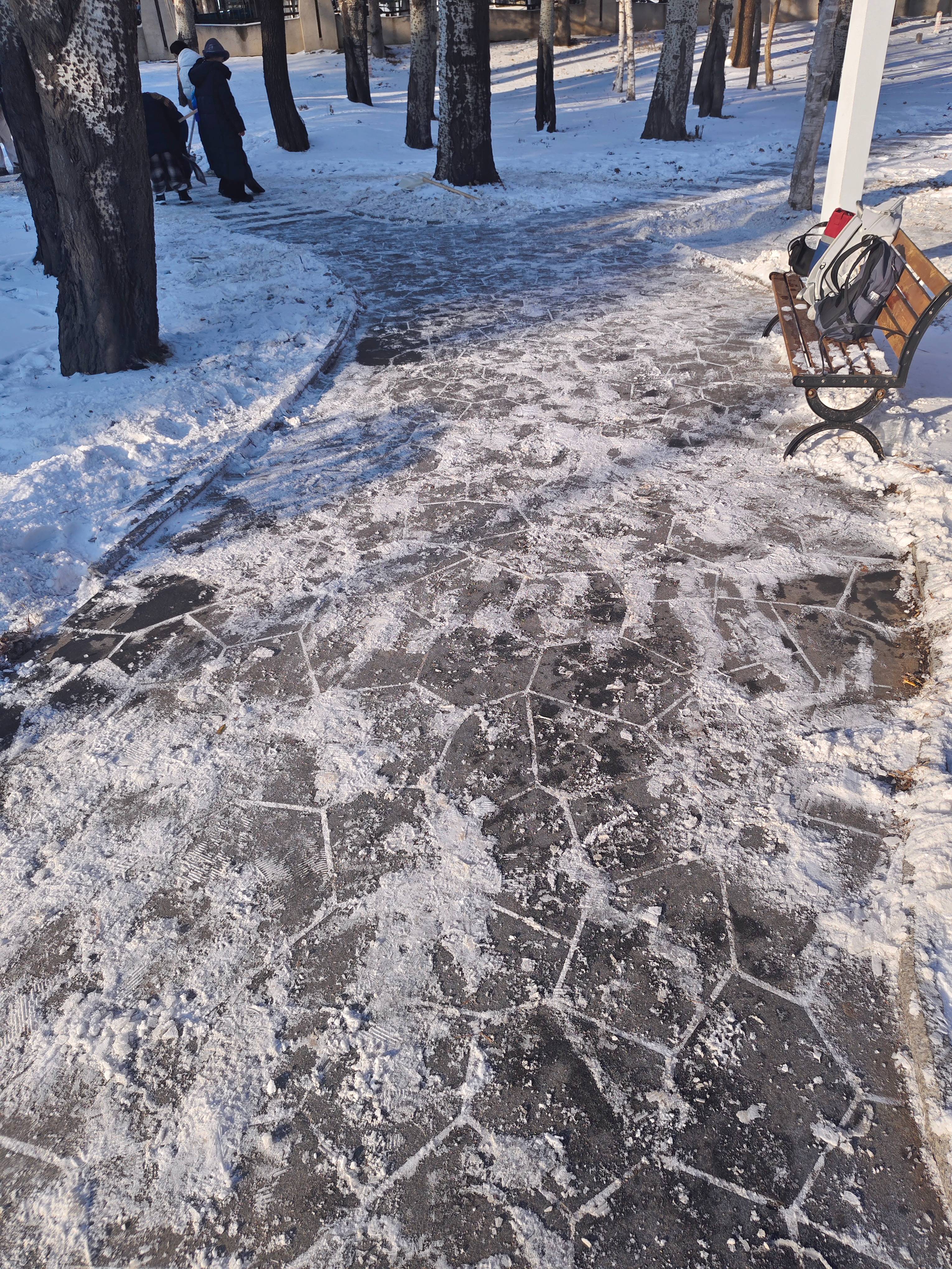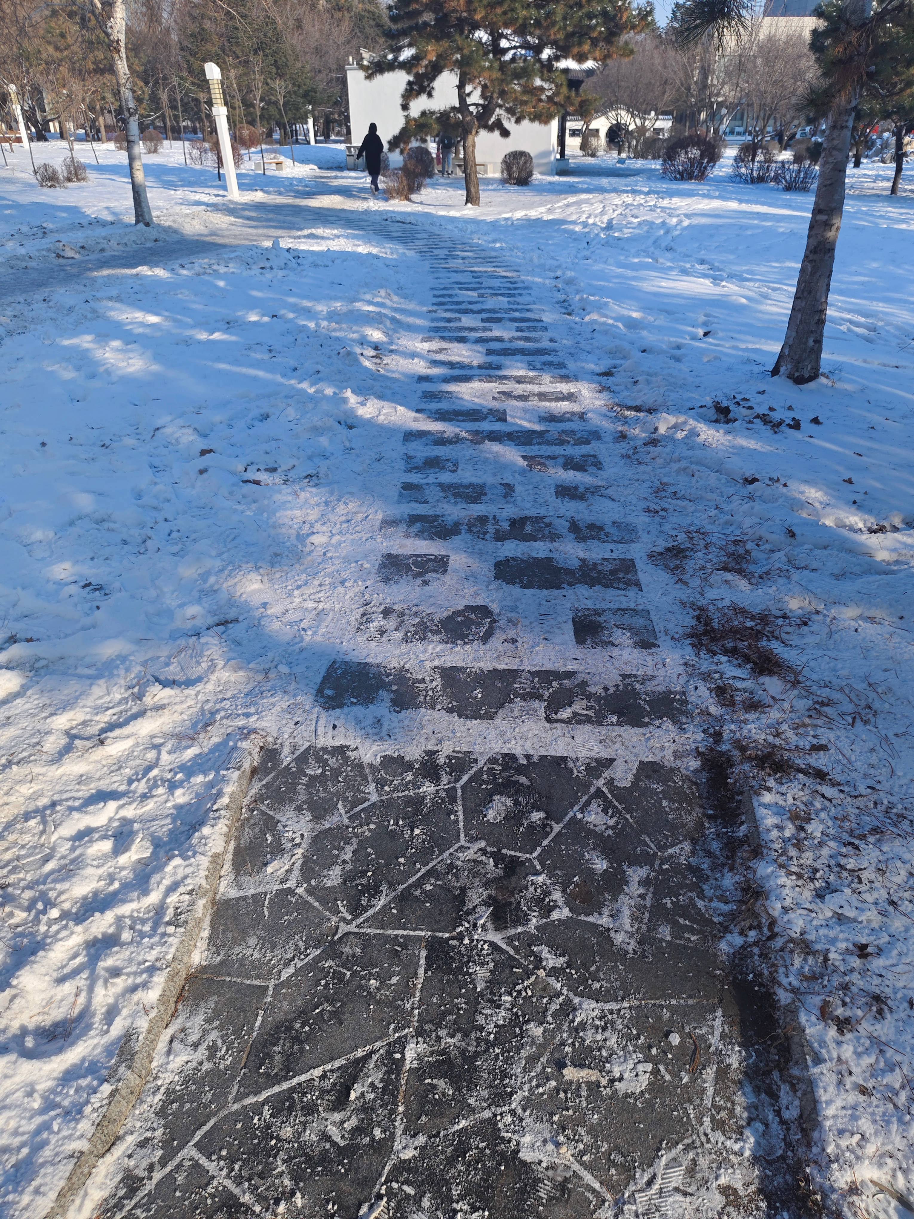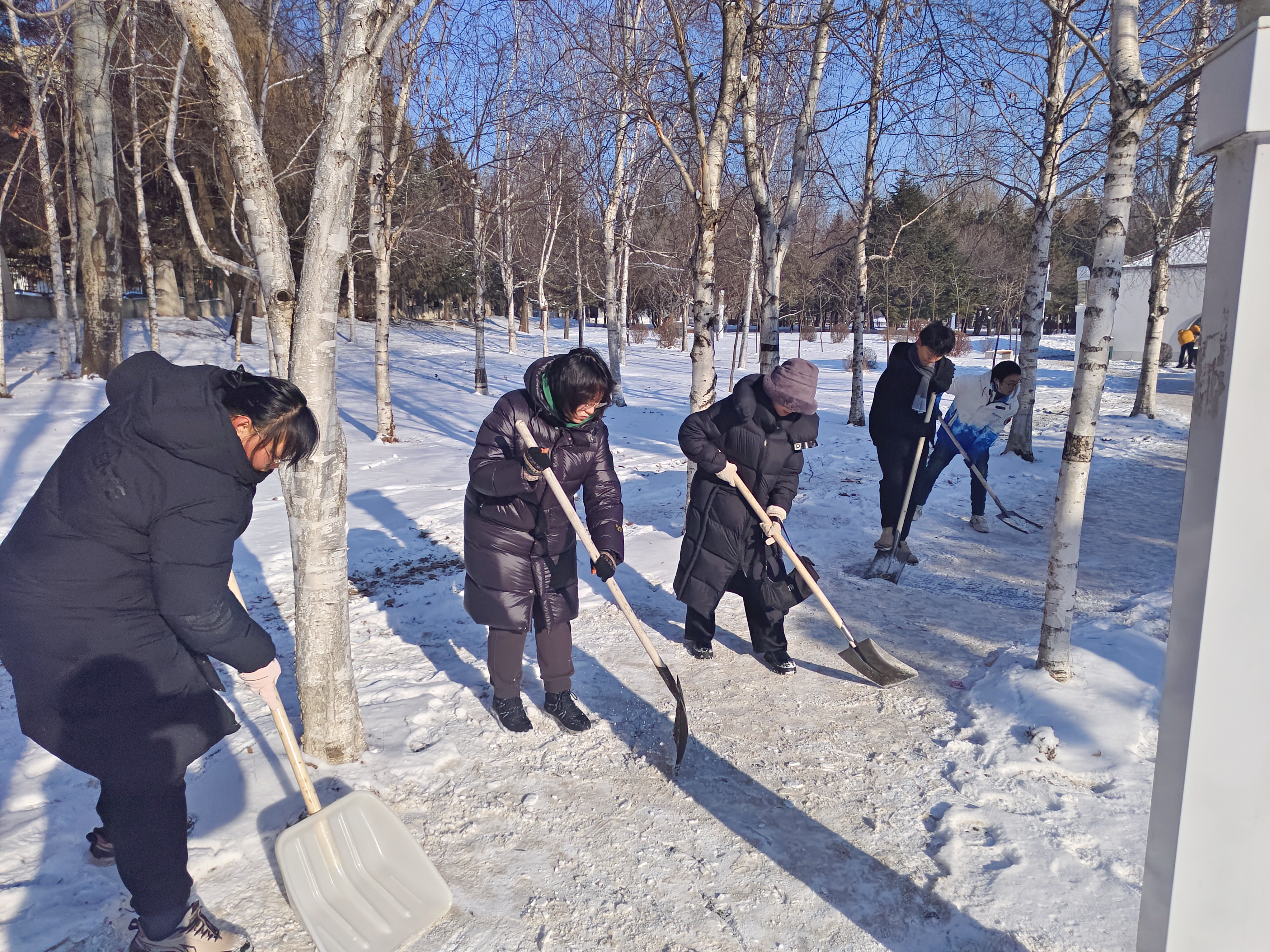 同学们不畏严寒,取用铁锹、雪铲等工具清除积雪、铲冰除冰,大家分工合理,配合默契,互帮互助,采用分区清理的方式,大大提升了扫雪除冰的效率。