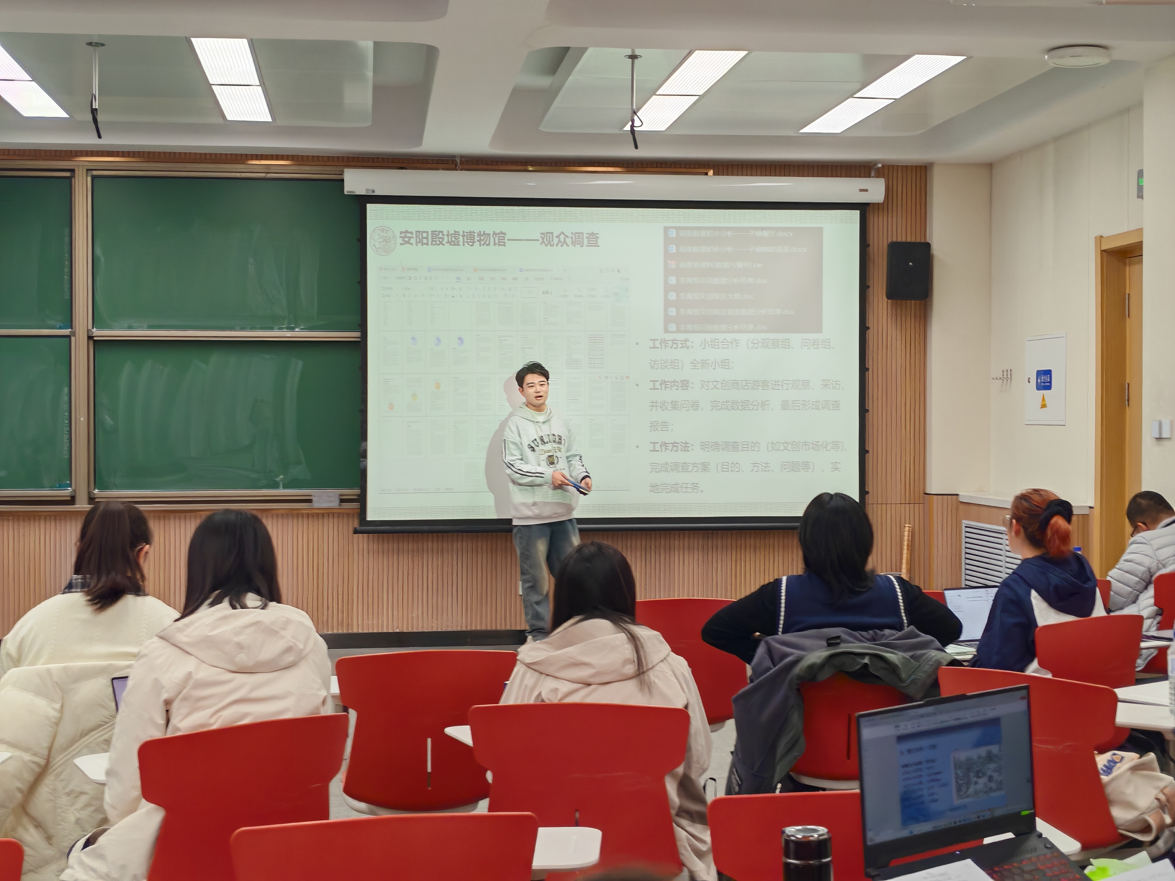 随后,文物与博物馆学专业的李禹恒、王笑扬两位同学联袂分享。他们结合在安阳殷墟博物馆、山西青铜博物馆的实习经历,从实习概况、日常工作、文化遗产地调研、衣食住行安排及结业考察五个维度,全方位拆解文博领域的实习要点。两人还分享了博物馆活动策划、配套讲解、海报设计、PPT 制作等实操工作的心得,同时强调展板内容需精准严谨。他们的分享让同学们深刻认识到,现代文博实习不仅需要扎实的专业功底,更考验运用新媒介、新思维讲好文物故事的综合能力。