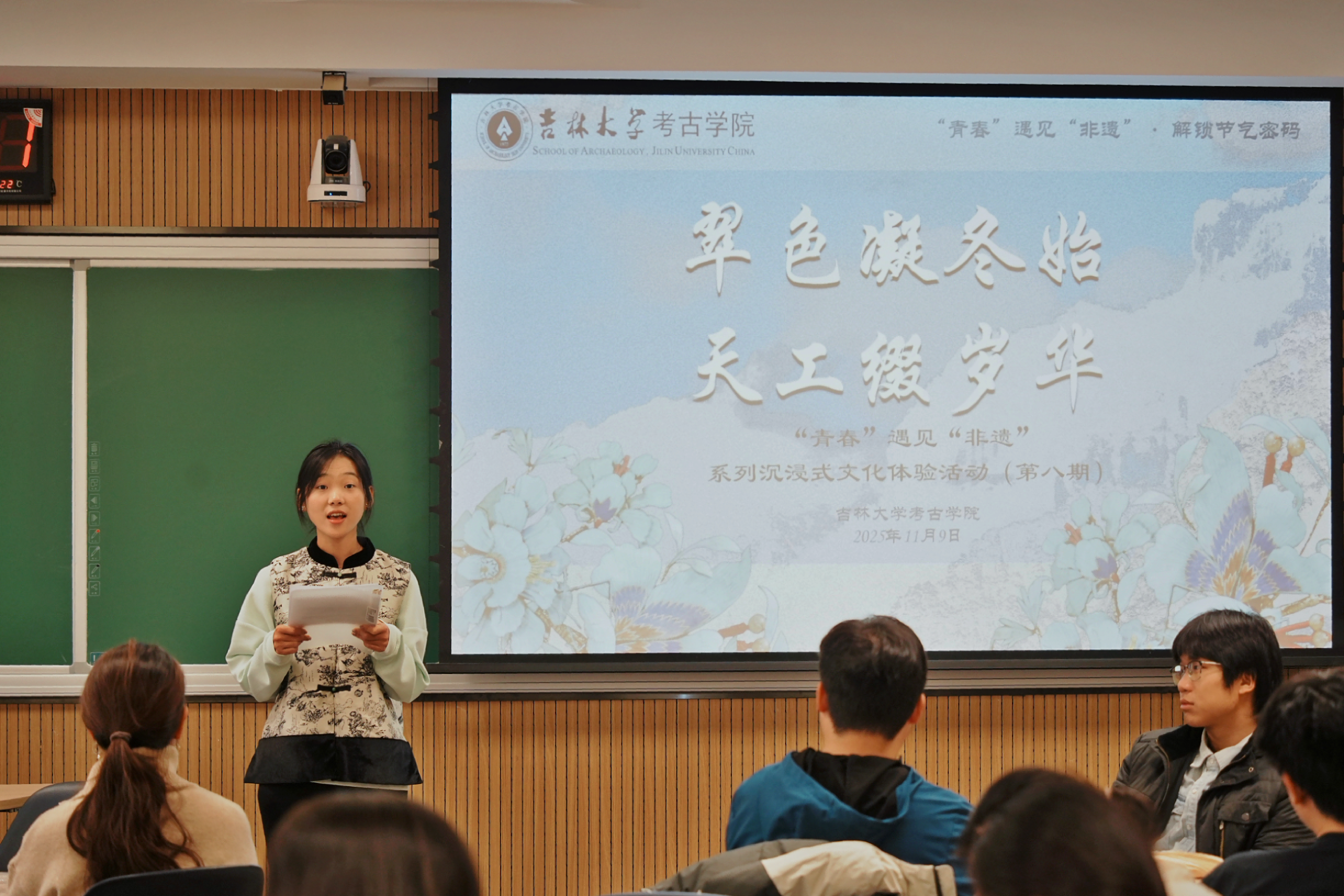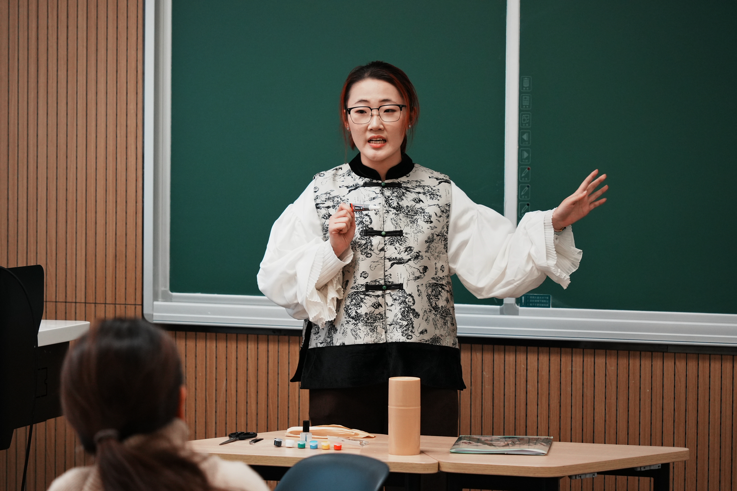 孙鹤菲从立冬民俗切入,生动讲述点翠工艺的发展历程,展现历代匠人的匠心独运。讲解尾声,她特别关注到点翠技艺曾经对环境造成的影响,呼吁同学们以环保理念为引领,让这门古老技艺在当代焕发可持续的生命力。