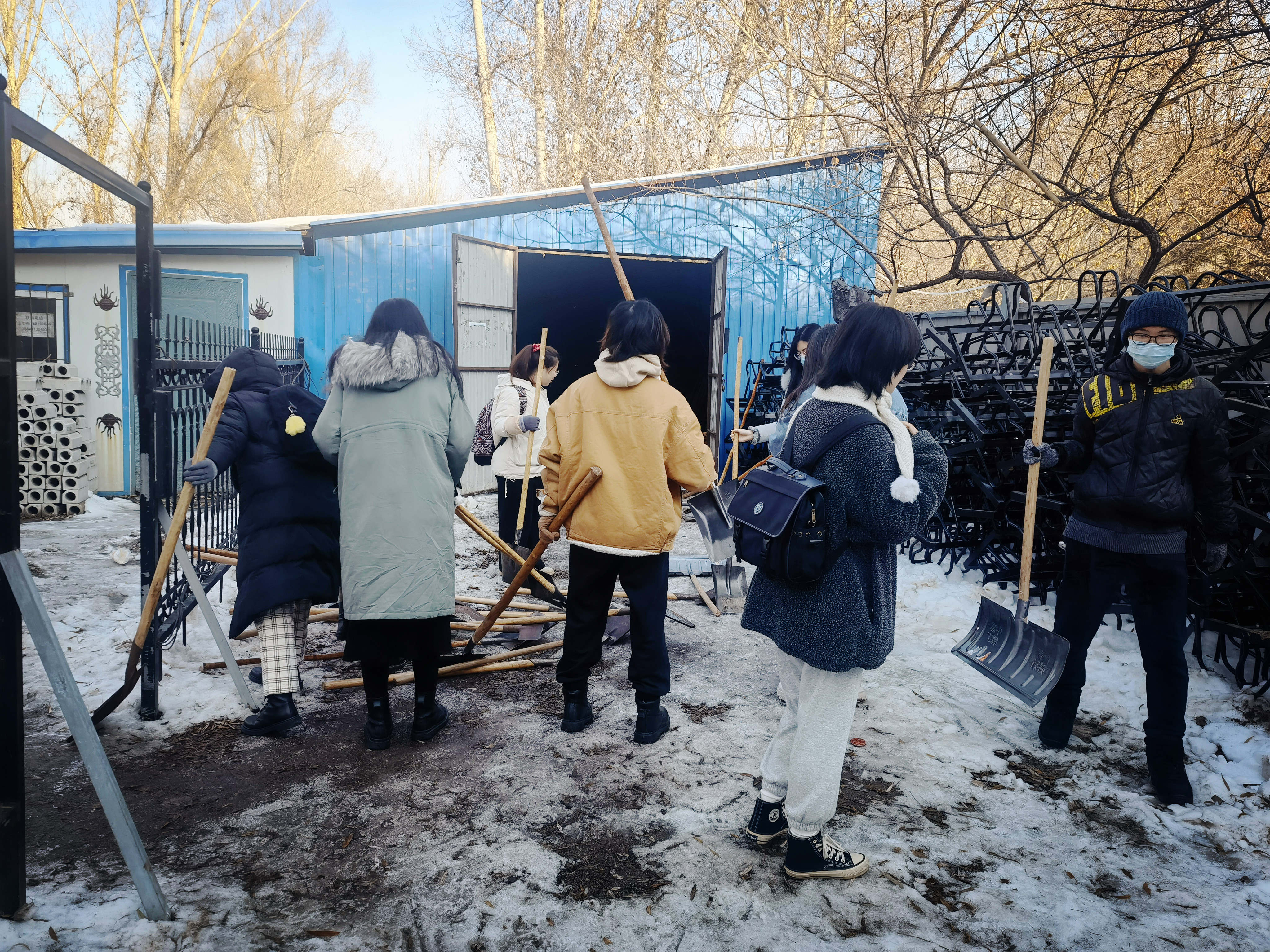 在校的党员和入党积极分子们活力满满、成群结队,拿着铁锹铲子等除雪工具,前往湖畔餐厅和学校邮局。冻僵的双手、刺骨的寒风无法冷却同学们的劳动热情,一个半小时后湖畔餐厅和邮局前侧以及北侧辅路被清理干净。师生就餐和办理邮寄的道路得到安全保障。