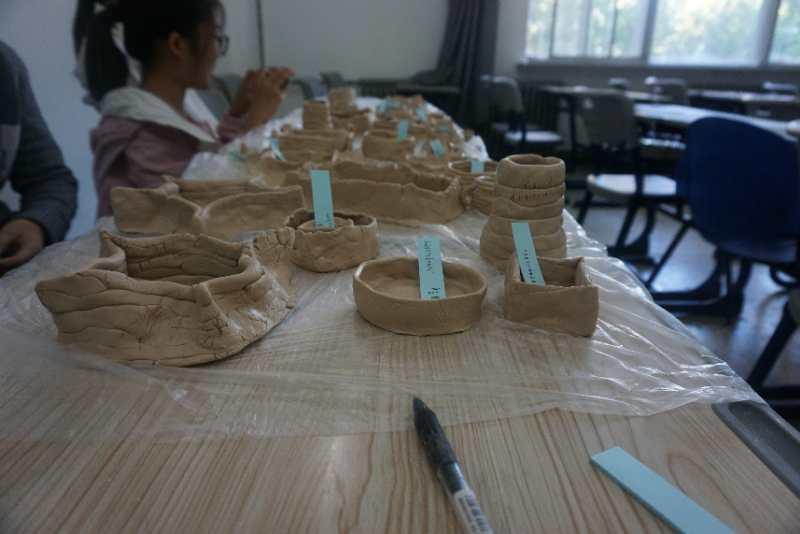 在师兄的分享结束之后,制陶活动正式开始。由工作人员将事先分装好的陶泥发放到每一个同学的手中,然后大家便开始了对自己手中这块陶泥的创作。与此同时  在场的工作人员也开始了指导与帮助,而且也会抽空自己动手创作一个作品。陶泥刚拿到手里,同学们都是毫无头绪,对着面前这个像面团一样的东西束手无策。不过经过大家一次次的尝试,大家也逐渐进入了状态,手中的陶泥也逐渐有了形状。慢慢的,一个又一个精彩的作品出现在了大家的桌上,引来其他人一阵阵的围观惊叹。渐渐地,教室后侧的课桌上已经摆满了大家各式各样的作品。在作品上放好标签后,同学们便满怀着成就感离开了活动教室。