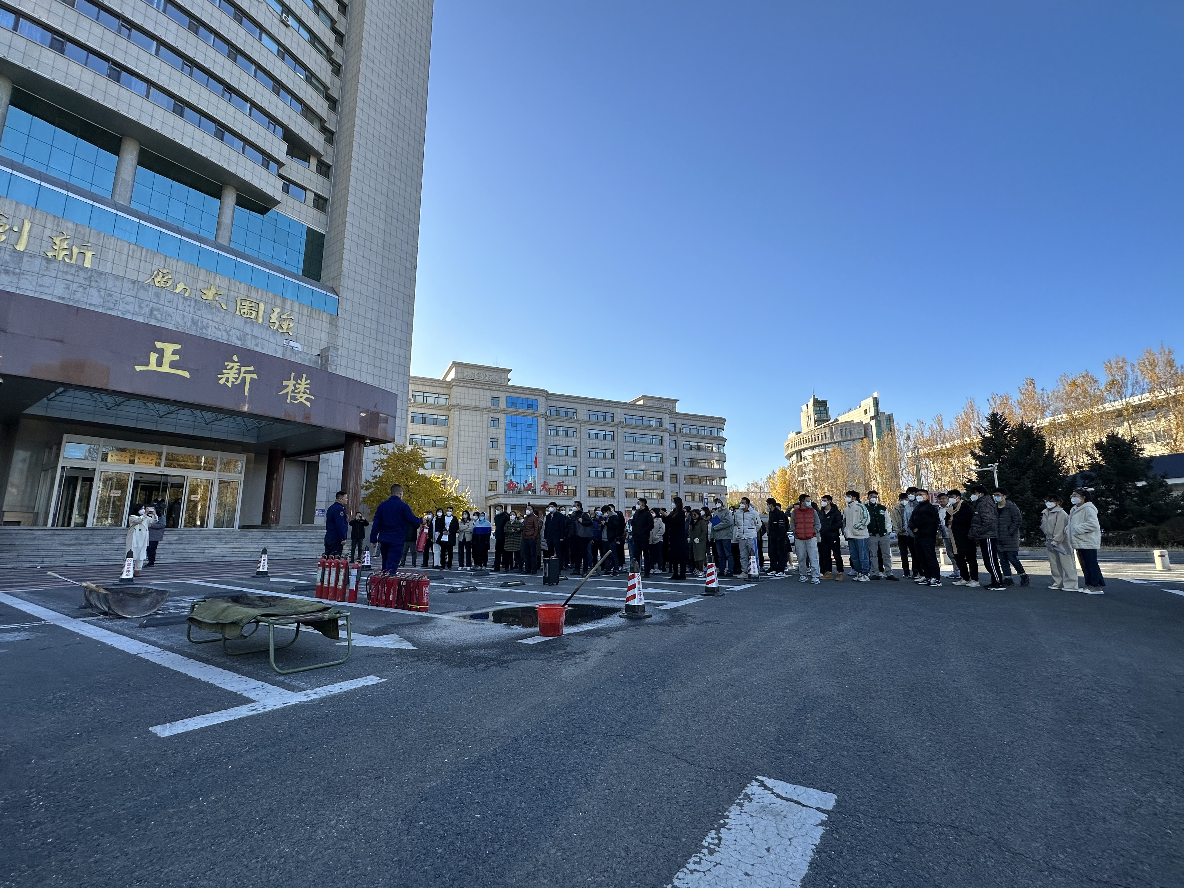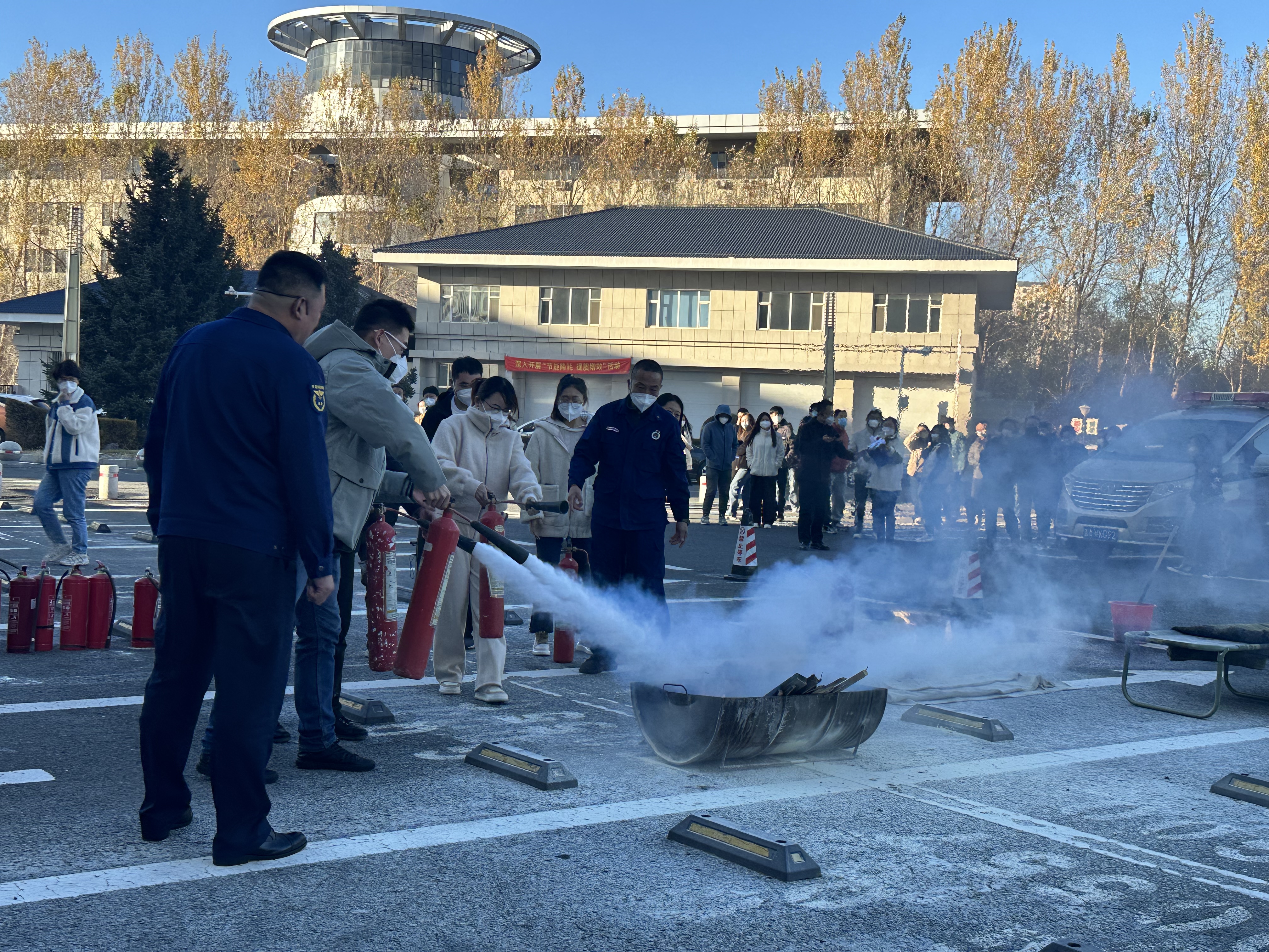 与人工智能学院在正新楼门前开展了火灾疏散逃生演练。保卫处在正新楼门前燃放了烟雾弹,随后警报响起,在消防广播的提示下,全体师生迅速从安全出口疏散撤离。全部人员撤离到安全区域后,在正新楼门前空地设置模拟火情,董立明为大家讲解了二氧化碳灭火器、干粉灭火器、灭火毯的使用方法及注意事项,并指导师生对初期火灾进行扑救。