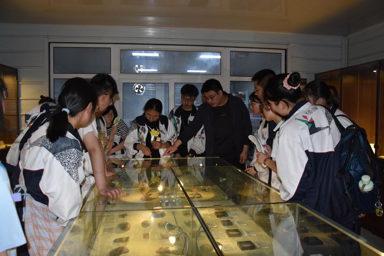 同学们轮流参观陈列室,通过研究生对发掘出土的遗物进行的详细讲解,对师村遗址的重要意义有了初步认识,明白了考古学是一门“透物见人”的学科。夏县师村遗址是晋南内涵最丰富的仰韶早期聚落遗址,揭示了黄河流域最早的夯土,填补了仰韶时代早期的空白,发现了中国最早的石雕蚕蛹,成为中华文化的重要标识。