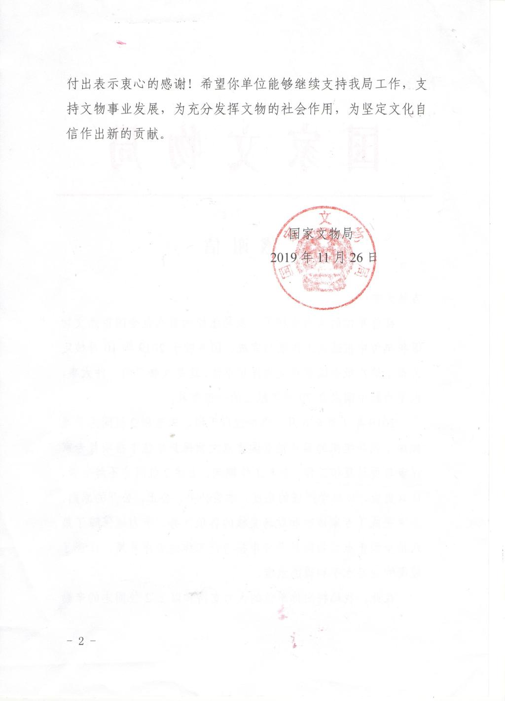 在此,我局特向你单位的大力支持和以上2位同志的辛勤付出表示衷心的感谢!希望你单位能够继续支持我局工作,支持文物事业发展,为充分发挥文物的社会作用,为坚定文化自信作出新的贡献。