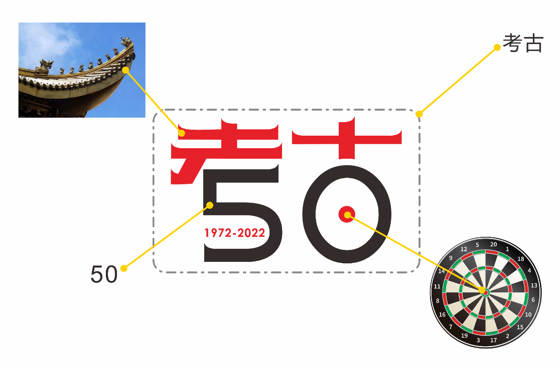 考古学科的发展蒸蒸日上。下半部分采用“共用形”的设计方法,将数字“50”与靶子图形巧妙融入,靶心位置象征中国特色、中国风格、中国气派的考古学建设目标。