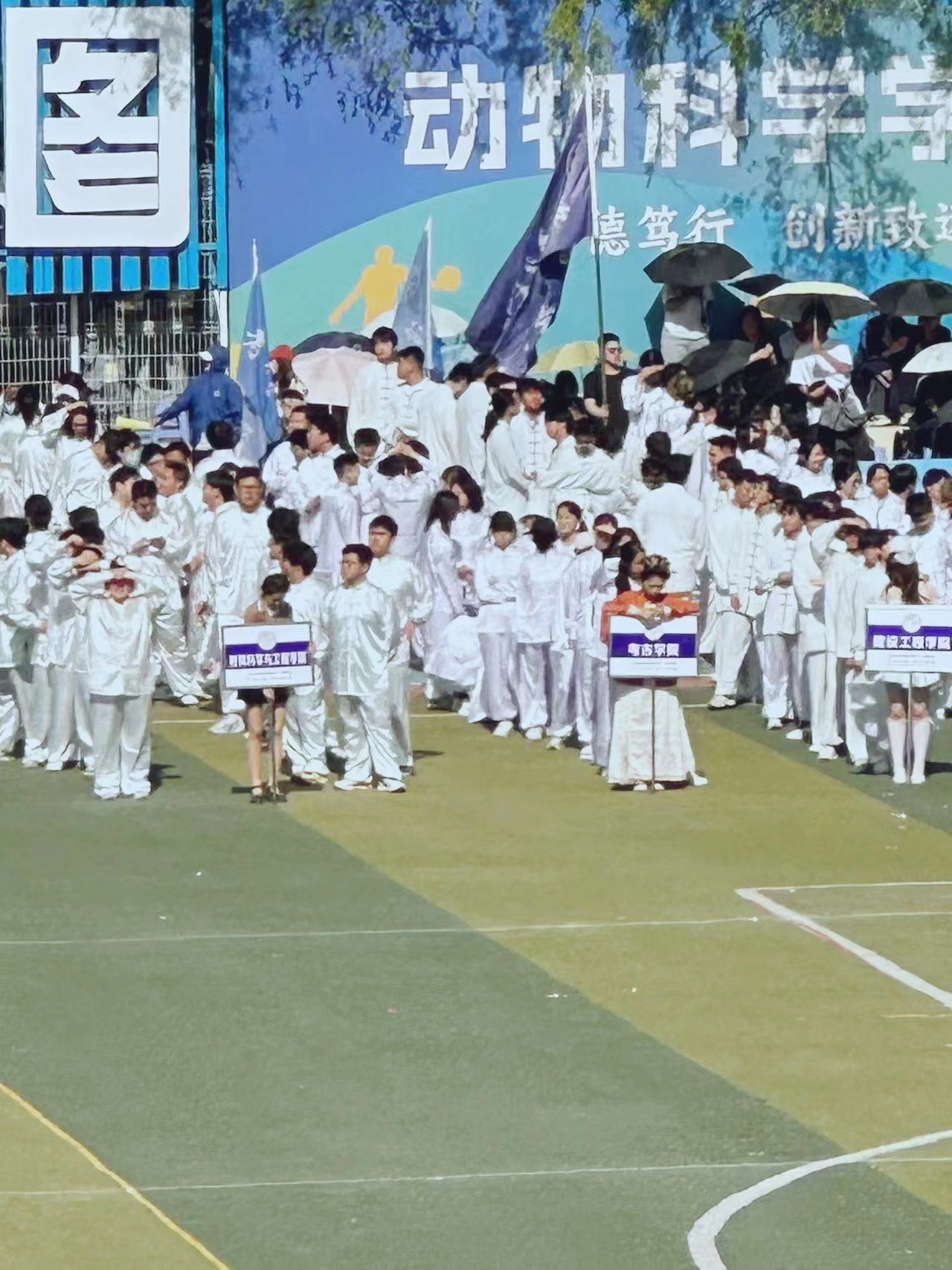 太极拳方队在赛场亮剑。随着悠扬音乐的响起,他们以柔韧的拳掌演绎着刚柔并济的韵律,在固定的招式之间蕴藏着乾坤之力。起承转合行云流畅,每一个动作都整齐划一,尽显青春风采。在各院学子的共同展示下,这场盛大的太极拳表演如诗如画,淋漓尽致地展现了同学们的精神风貌,成为运动会闭幕式的绚丽风景。