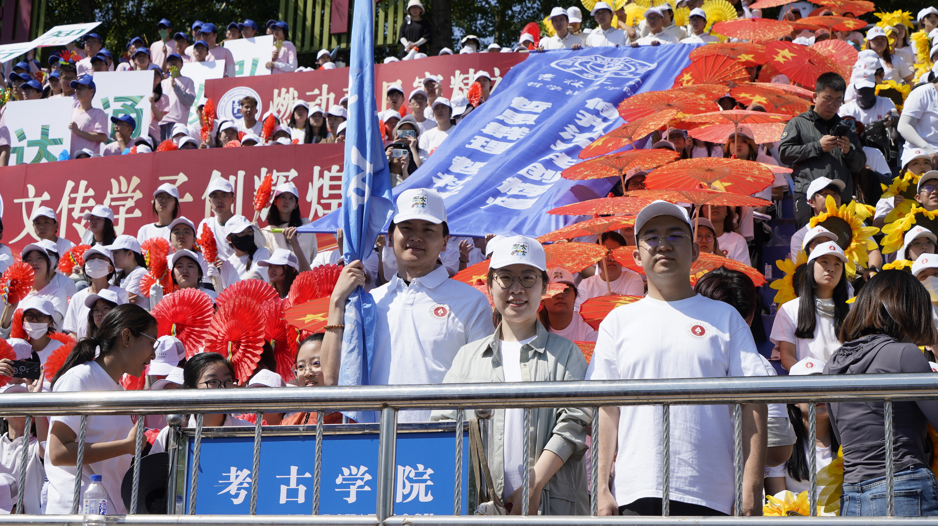 独特logo的文化衫,手握鲜艳如火的红油纸伞,随着鼓点的节奏,在微风中轻盈地撑起、优雅地旋转、摇曳生姿、利落收束,展现出磅礴大气、威武不凡的风采。每一个动作都如行云流水般自然流畅,每一句口号都如穿云裂石般铿锵有力、激荡人心,尽显考古学子们默契协作的团队精神与磐石般的凝聚力。