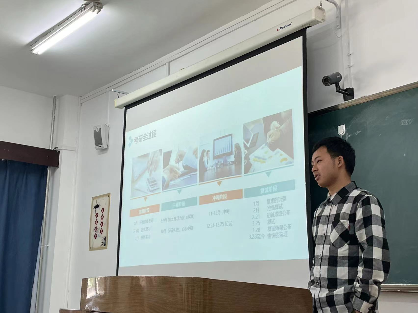 徐畅萱同学首先介绍了本校研究生的招生方向,然后以时间为轴线将考研分为准备阶段、攻坚阶段和冲刺阶段,并分别讲解了每一阶段的复习流程和经验。最后,她还准备了初试和复试的小贴士与同学们分享。