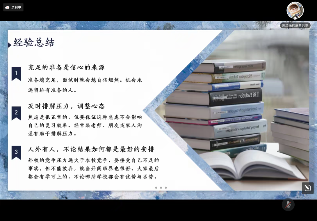 最后一位分享人是保研至复旦大学的焦越涵。她告诉大家要及时进行面试总结,根据需要对自己准备的内容进行补充。她还针对面试出题角度进行了详细讲解,提醒大家要充分了解自己提交的资料。最后,她也勉励大家,良好的心态和充分的准备是很重要的,不论结果如何都是最好的安排。