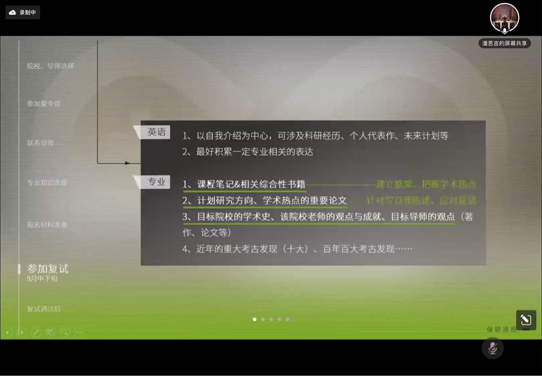 考古专业最后一名分享人是保研至中国社会科学院大学的魏皓晨同学。她告诉同学们要明确自己的兴趣方向,这有利于大家选择目标院校及导师。随后,她列出大一至大三学习生活中的几个重要时间节点,着重强调了英语的重要性。