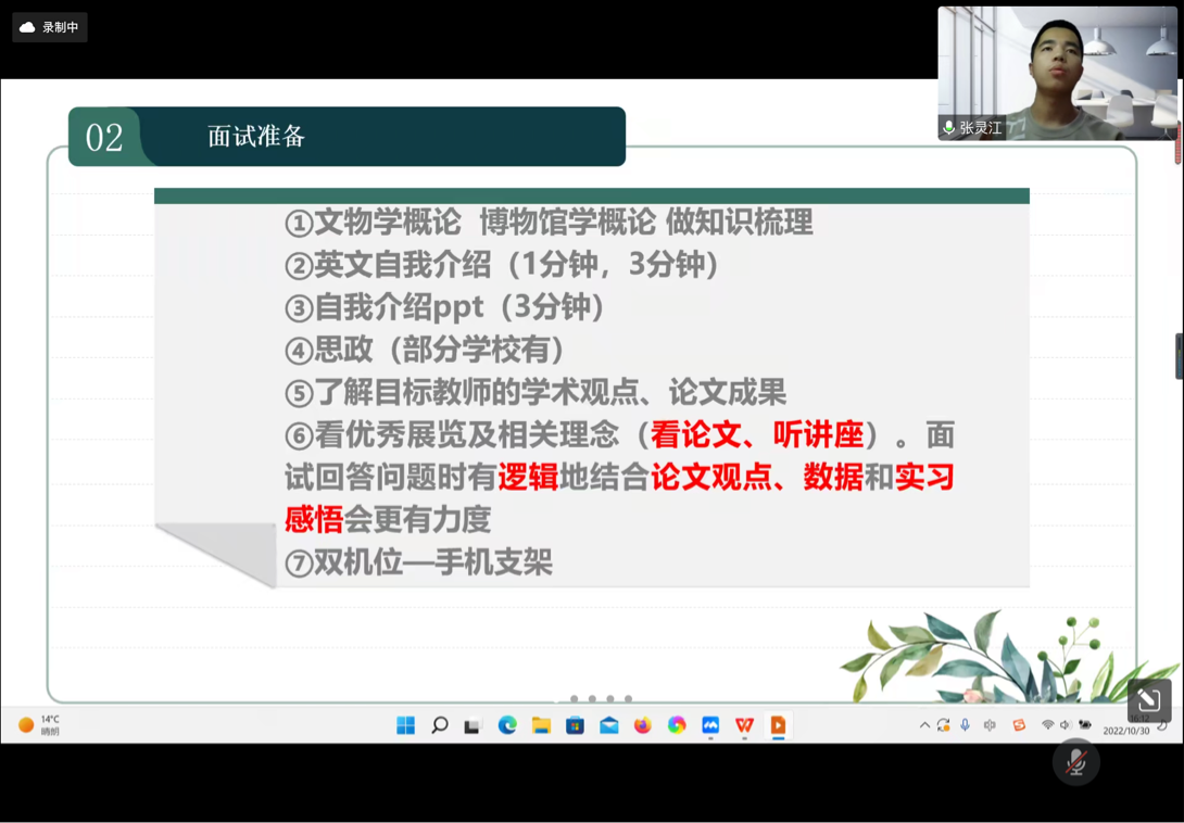 接下来是文博专业的保研分享。首先是张灵江同学对于保研本校具体要求的介绍。针对文博专业面试中的专业课提问,他将需要的工作分成两部分,一部分是“早准备、少而精”的有关基础能力的内容,另一部分是“就近准备、多了解”的一些拓展内容,系统分析了需要准备的主要材料。