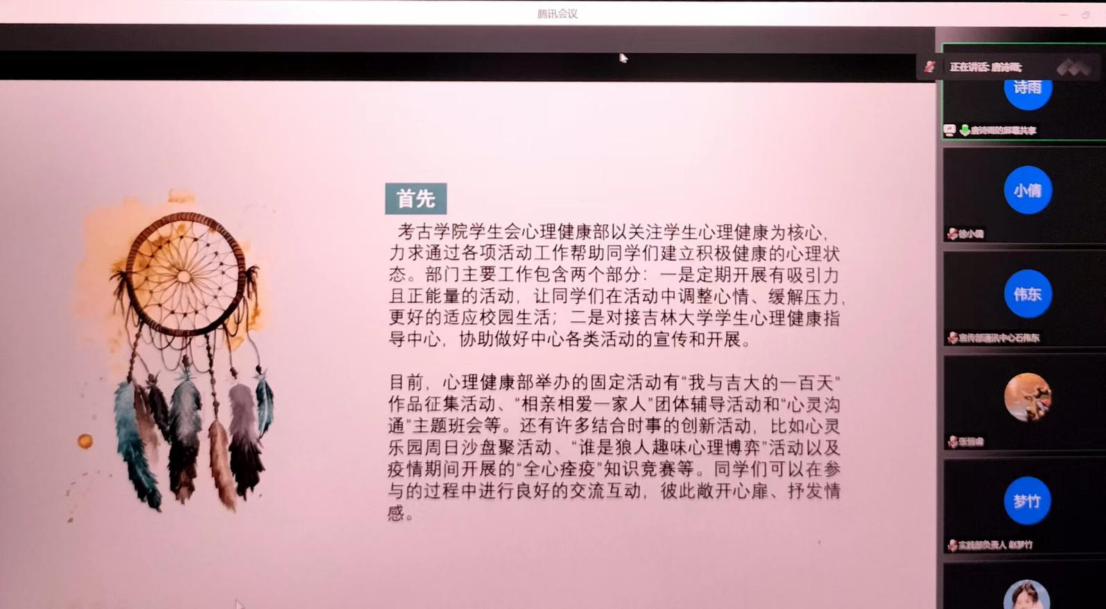 接下来,学生会的四位部门负责人围绕学生会服务同学的宗旨,面向同学全面发展的个人需求,进行各具特色的学生会部门介绍。学生会主席团成员兼心理健康部负责人唐诗雨介绍了部门举办的固定活动和创新活动,说明了部门关注学生心理健康的核心任务;学生会主席团成员兼校园文化部负责人张航介绍了部门一年来举办和合作举办的各项文体活动,展现了部门在丰富同学校园生活方面的导向作用;综合事务部负责人吴芊妤介绍了部门承担的档案、活动经费等方面的记录上报任务,点出了部门承担的后勤保障工作;科研学术部负责人陈嘉琦介绍了部门组织的形式多样的学习、学术分享活动,讲述了部门活动帮助同学适应学习生活、迎接学习挑战的重要目的。