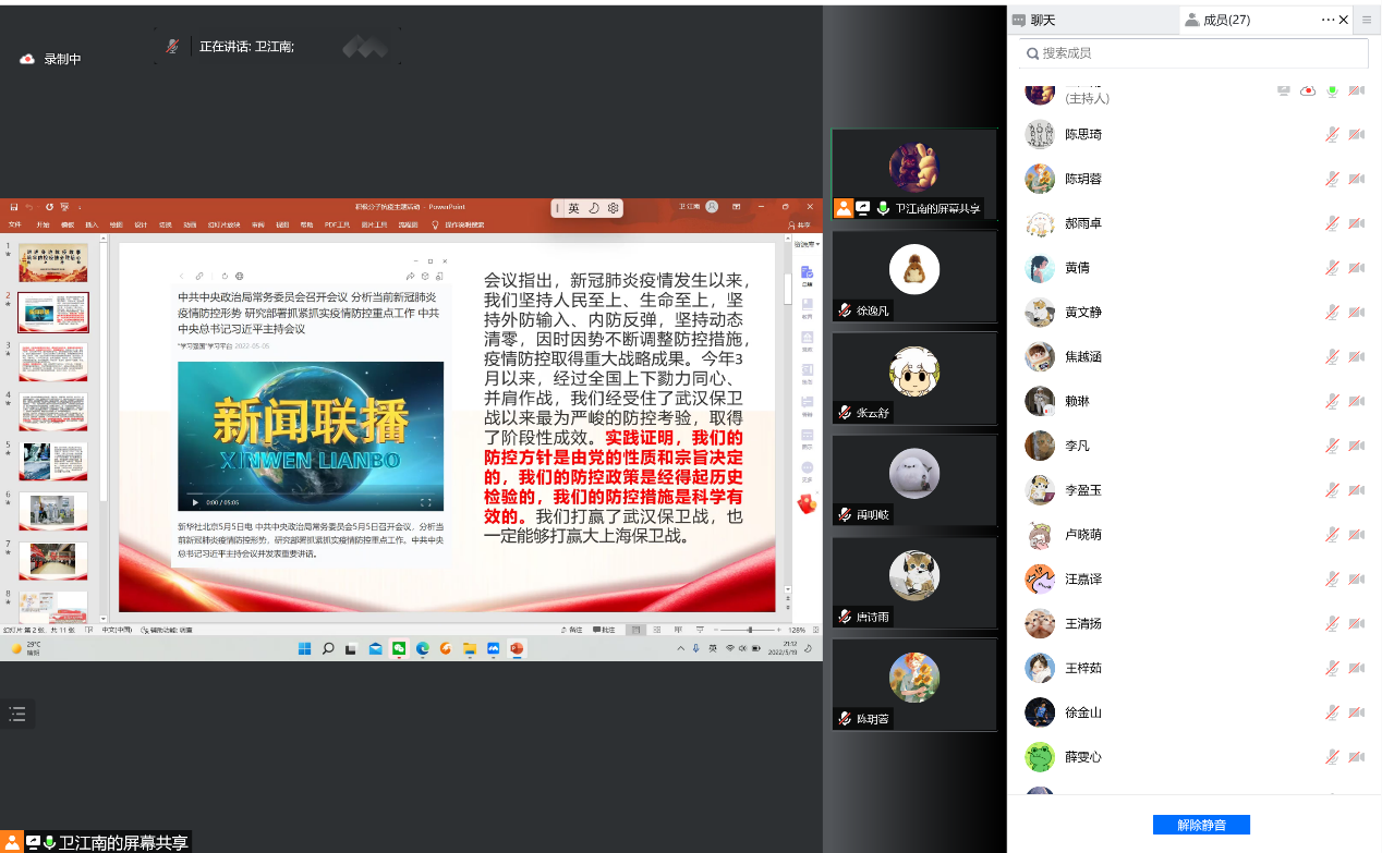 会议伊始,卫江南带领大家学习了习近平总书记于5月5日在中央政治局常委会会议上的重要讲话。结合当前吉林省的疫情防控形势,卫江南表示,实践已经证明我们的疫情防控政策是科学有效的。此次中共中央政治局常委会的召开对于坚定防疫政策、凝聚防疫共识、巩固防疫成果具有重要意义。作为入党积极分子,每一位与会同学都应当深刻、全面认识党中央确定的疫情防控方针政策,认真领会并坚定支持“外防输入、内防反弹”总策略和“动态清零”总方针,自觉同一切歪曲、怀疑、否定我国防疫方针政策的言行作斗争。