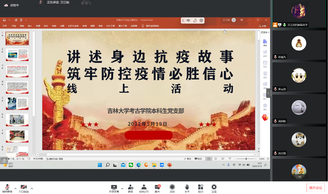 本科生党支部组织入党积极分子开展了“讲述抗疫故事,筑牢防控疫情必胜信念”线上主题党日活动。活动由2020级考古班团支书卫江南主持,学院全体入党积极分子参加了此次活动。活动共分两部分,一是深入学习习近平总书记5月5日在中央政治局常委会会议上的重要讲话精神,二是讲述身边的抗疫故事。
