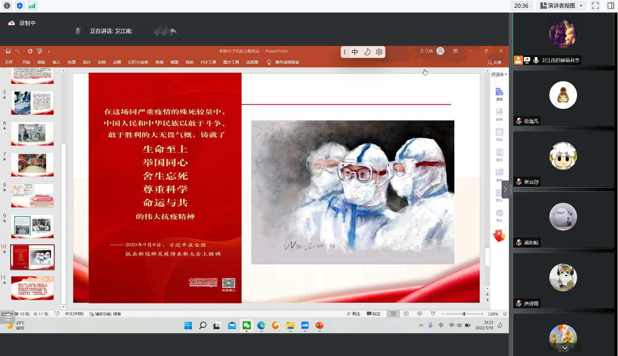 两位同学的发言引起了与会同学们的共鸣,大家也都以不同的方式表达了对学校、对志愿者同学的感恩。会议最后,卫江南同学引用习近平总书记的讲话,鼓励入党积极分子们学习并践行 “生命至上、举国同心、舍生忘死、尊重科学、命运与共”的伟大抗疫精神,要学会深入分析局势,全面权衡,准确识变,善于从眼前的危机、眼前的困难中捕捉和创造机遇,不断在磨难中成长、从磨难中奋起!
