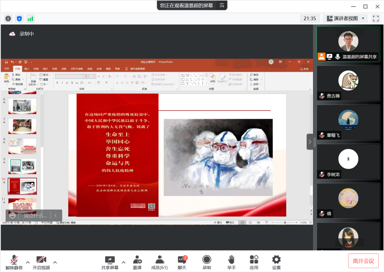 最后,主持人号召全体党员和预备党员同志要时刻牢记自己的党员身份,坚定立场,和党中央时刻保持一致,用自身的行动和实践去驳斥消极抗疫的错误观点,始终坚持生命至上、举国同心、舍生忘死、尊重科学、命运与共的伟大抗疫精神。他引用习近平总书记的两段话送给与会同学——“要深入分析,全面权衡,准确识变,科学应变,主动求变,善于从眼前的危机,眼前的困难中捕捉和创造机遇”、“中华民族历史上经历过很多磨难,但从来没有被压垮过,而是愈挫愈勇,不断在磨难中成长,从磨难中奋起”。