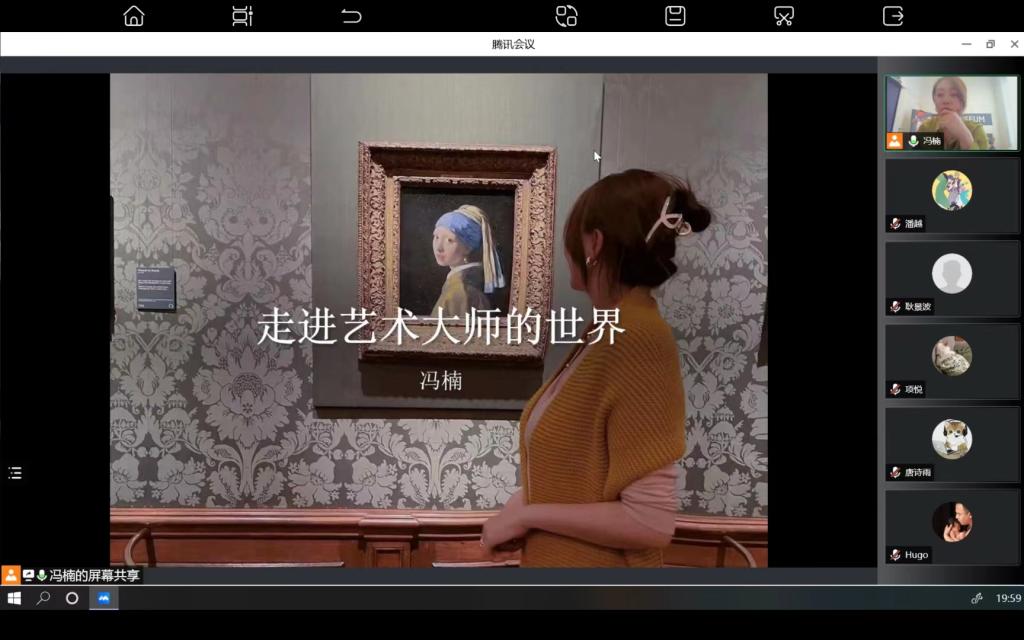 随后,冯楠老师介绍了另一位绘画大师——维米尔,他是荷兰黄金时代最伟大的画家之一。他对光线的运用达到了极致,光影的灵动加之笔触的细腻,使他在绘画艺术史上享有极高的地位。风景画《代尔夫特的风景》是维米尔在穷困潦倒中,投身于艺术而创作出的油画作品,彰显着他身无长物却依旧平和宁静的大师风度;《花边少女》中少女的情思和哀怨被他捕捉;《情书》中,弹琴的少女接到了情人所送的情书,惊喜的神态被刻画得极为传神;在《戴珍珠耳环的少女》这幅名画中,少女微张的嘴唇、含情的双眼、柔润的皮肤,则穿越时空向今人倾诉着自己的故事……在冯老师的介绍中,同学们“云”游着阿姆斯特丹的名画博物馆,聆听着画作与画家背后的故事,并踊跃与冯老师互动,课堂氛围十分热烈。