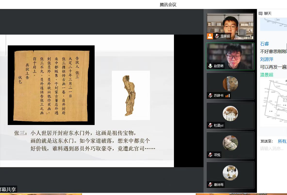 赵里萌老师从自己的学术论文《清明上河图》地理位置新探中的研究论点出发,穿越千年,与大家一起搜集线索、抽丝剥茧,寻找《清明上河图》中的彩蛋,在北宋东京城里开展了一场烧脑的“推理探案”。活动伊始,赵老师以幽默诙谐的语言和幻灯片营造出了欢快热烈的课堂氛围。活动正式开始后,同学们紧跟老师思路,抓住机会踊跃发言,积极与老师互动,并参与投票与答题。其间,赵老师不时穿插精彩讲解,逐一为我们揭示了历史名画中隐藏的秘密。活动过程中,各环节的问答热火朝天,学术氛围浓厚,同学们兴致勃勃,获得了极强的参与感。