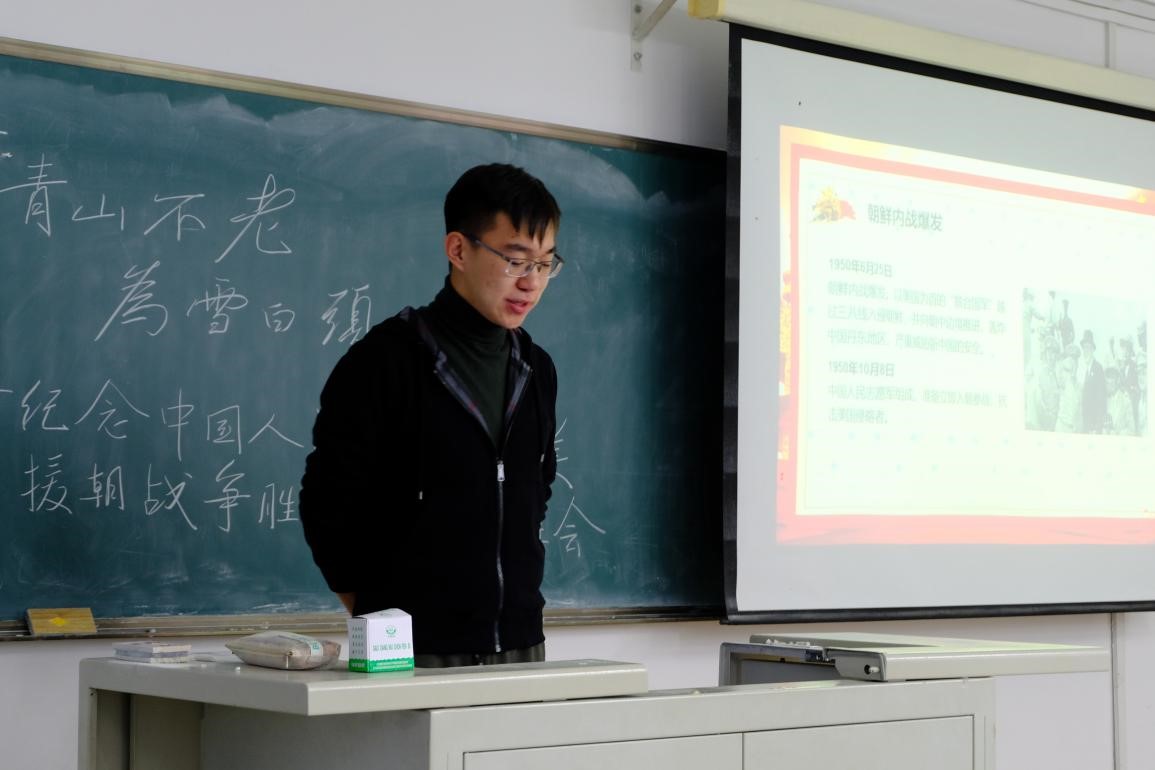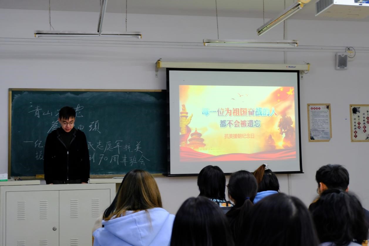 2019级本科生于经信教学楼D110教室开展了主题为“青山不老,为雪白头”纪念中国人民志愿军抗美援朝战争胜利70周年主题班会,班会的主要内容是观看抗美援朝专题纪录片《为了和平》,本次班会由温景超主持,JAVDB