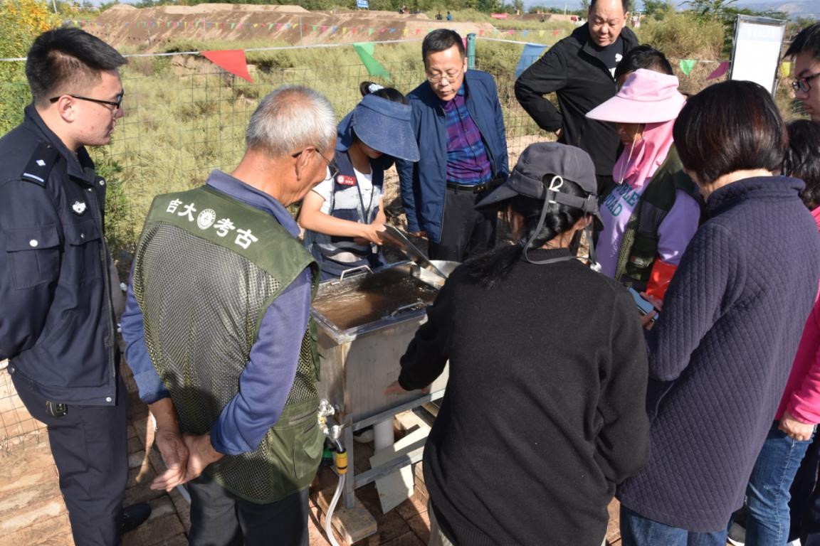 本次活动于当天下午15:00准时开展。学生提前十分钟至工地参观入口,等候各位参观者的到来。在活动中,每位学生首先为各位参观者讲解陈设展板,由浅到深,普及文物和考古知识,随后带领参观者步行环绕整个考古发掘区,让参观者能够近距离观察考古发掘过程,看到考古发掘中的人和物,真正领略到考古的价值和魅力。在讲解中,参观者对于刮面和浮选法的操作饶有兴趣,同学们精彩的讲解也得到了参观者的一致好评。