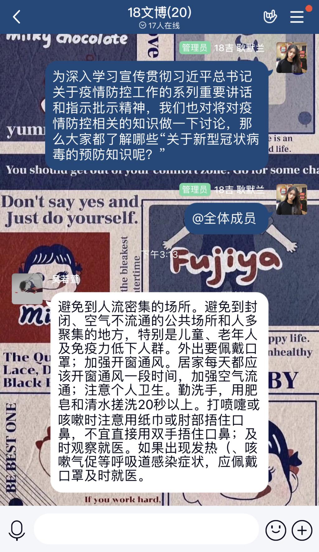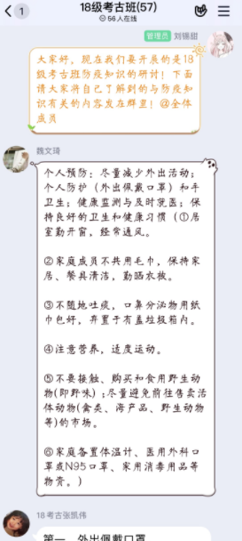 本科全体团支部依托qq群、微信群举办防疫知识研讨团日活动,积极开展防疫知识科普,着重讨论了关于疫情防控所注意的事项,并以团支部为单位,宣传青年学生投身疫情防控、复工复产的生动故事和先进事迹。本次活动丰富了同学们的防疫知识,激发大家学习了解防疫知识的热情,取得了同学们的广泛回应与强烈反响。