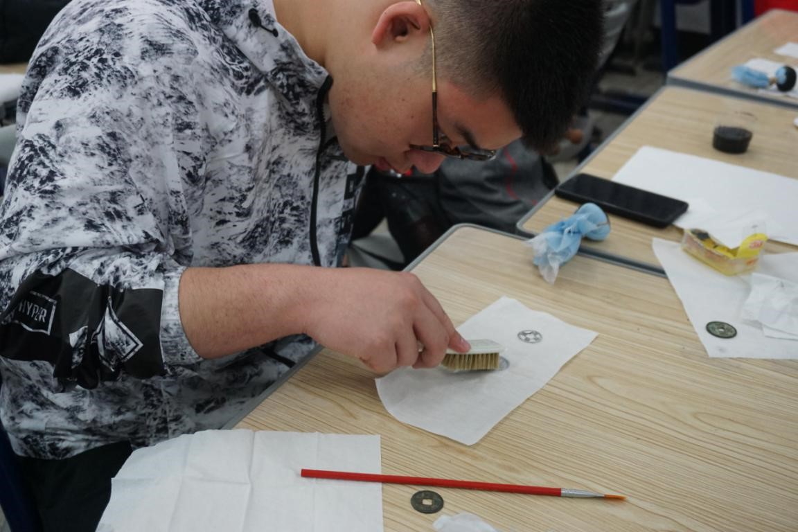 首先,2016级的博士生武松同学向大家介绍了拓印这种用以记录花纹和文字的技法。他解释到:拓印作为田野考古工作中一种不可缺少的记录手段,广泛应用于记录器物上的文字、花纹和图案,如用于记录甲骨文字、铜器铭文、墓志铭、古钱币、画像砖、画像石、瓦当、陶器纹饰等。武松学长还向大家介绍了拓印所具有的优点以及拓印所需要的工具。接下来,学长向大家系统地介绍了拓印的流程,并播放两段生动的拓印教学视频。最后,学长强调了拓印文物过程中不得对文物本体造成伤害,拓印是为了更好的展示与研究文物,某种意义上讲对文物亦是一种保护。国家文物局亦曾颁布《文物复制拓印管理办法》对文物拓印作了相关规定,大家日后走上工作岗位若涉及文物拓印工作,需严格遵循《文物复制拓印管理办法》。在大致了解了拓印的理论知识后,同学们在武松学长的指导下首先学习如何制作拓包,然后进行拓印铜钱的实践操作。期间虽然遇到了诸如宣纸无法紧贴器物、墨水洇渗等等问题,但在学长的帮助与指导下同学们最终还是成功拓印了自己手中的器物。