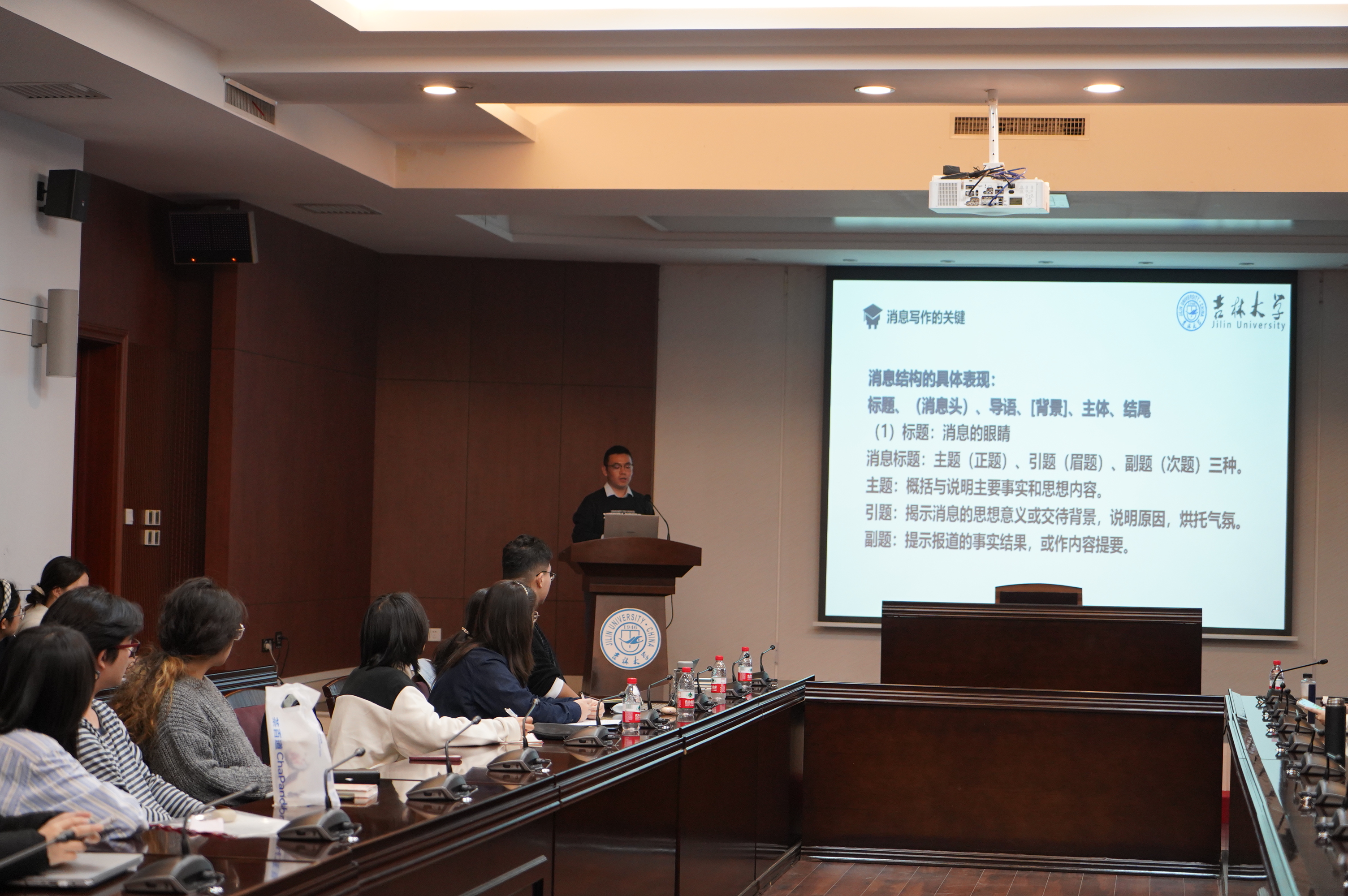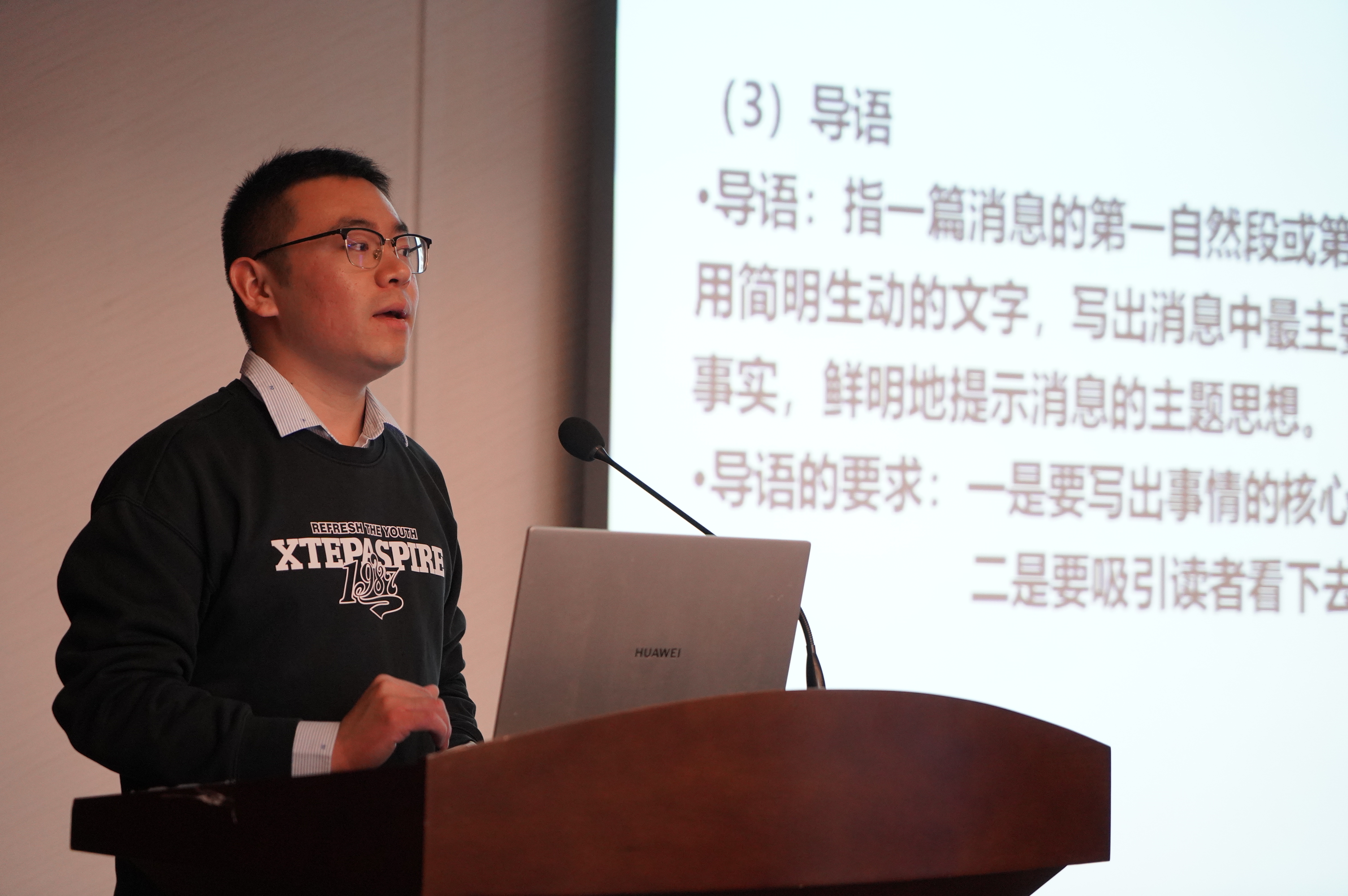 在新闻写作专题培训环节,马克思主义学院2023级博士研究生芦猛受邀来到现场,为大家倾情指导通讯稿写作要点,以形象生动的案例、通俗易懂的言语揭示了消息与通讯写作的特点与区别,介绍了一些新闻写作技巧,分享校园新闻采写的相关经验。此外,芦猛注意到新闻写作中的细节问题,并给予相应建议,提醒同学们注意新闻规范。