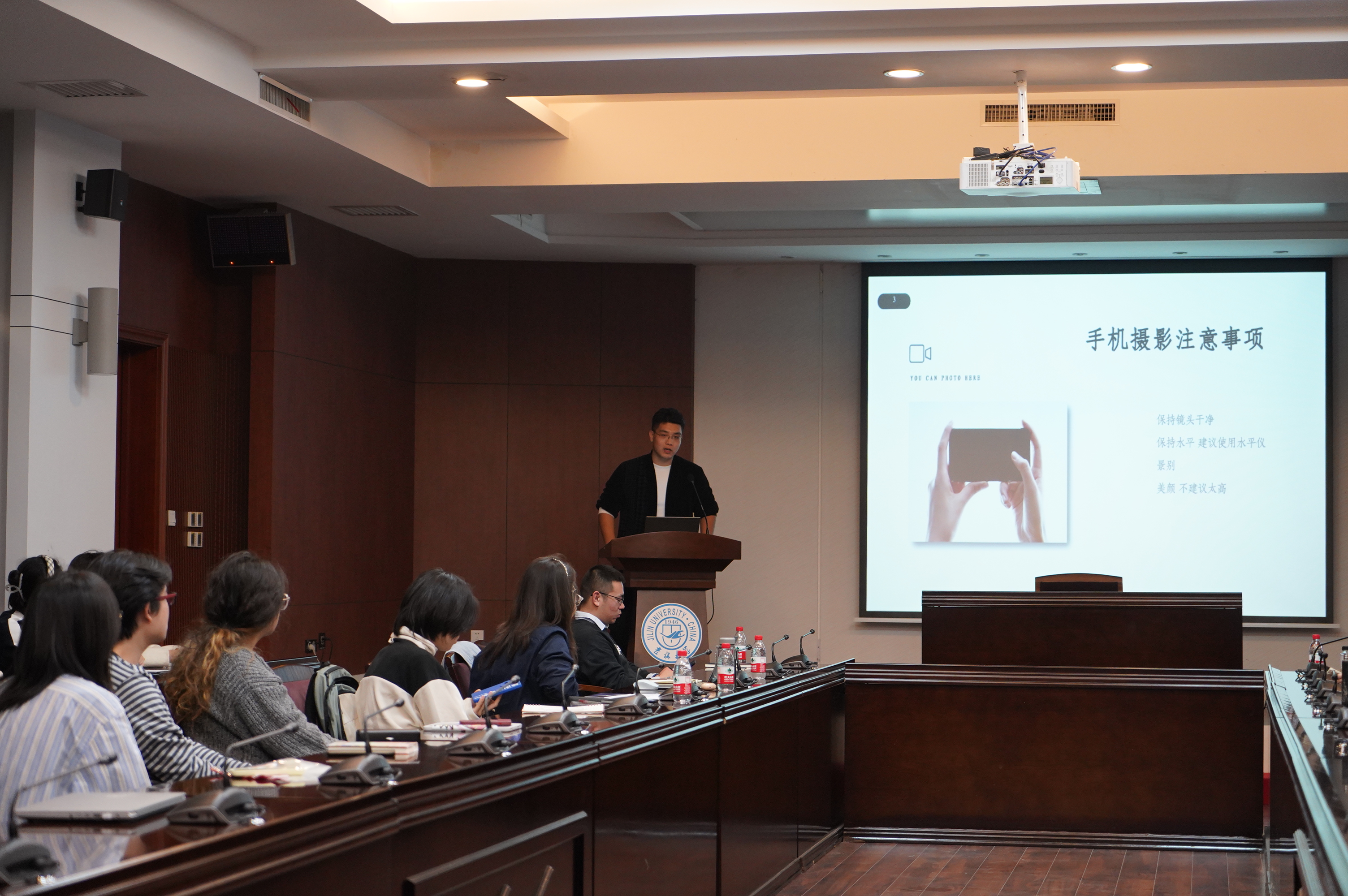 摄影技能专题培训环节中,2023级硕士研究生王克豪重点分享了摄影的规范问题,从不同设备摄影注意事项、合影站位、旗帜规范、摄影师站位与构图及其他注意事项五大方面,向同学们讲述摄影中易被忽视的重点,强调注重照片规范与审美,避免增加后期工作难度。同时,他对我院近期活动照片进行评析,指出一些照片的不足之处,点出部分照片的亮点,让同学们更有针对性地对各自的摄影技术加以完善与改进。